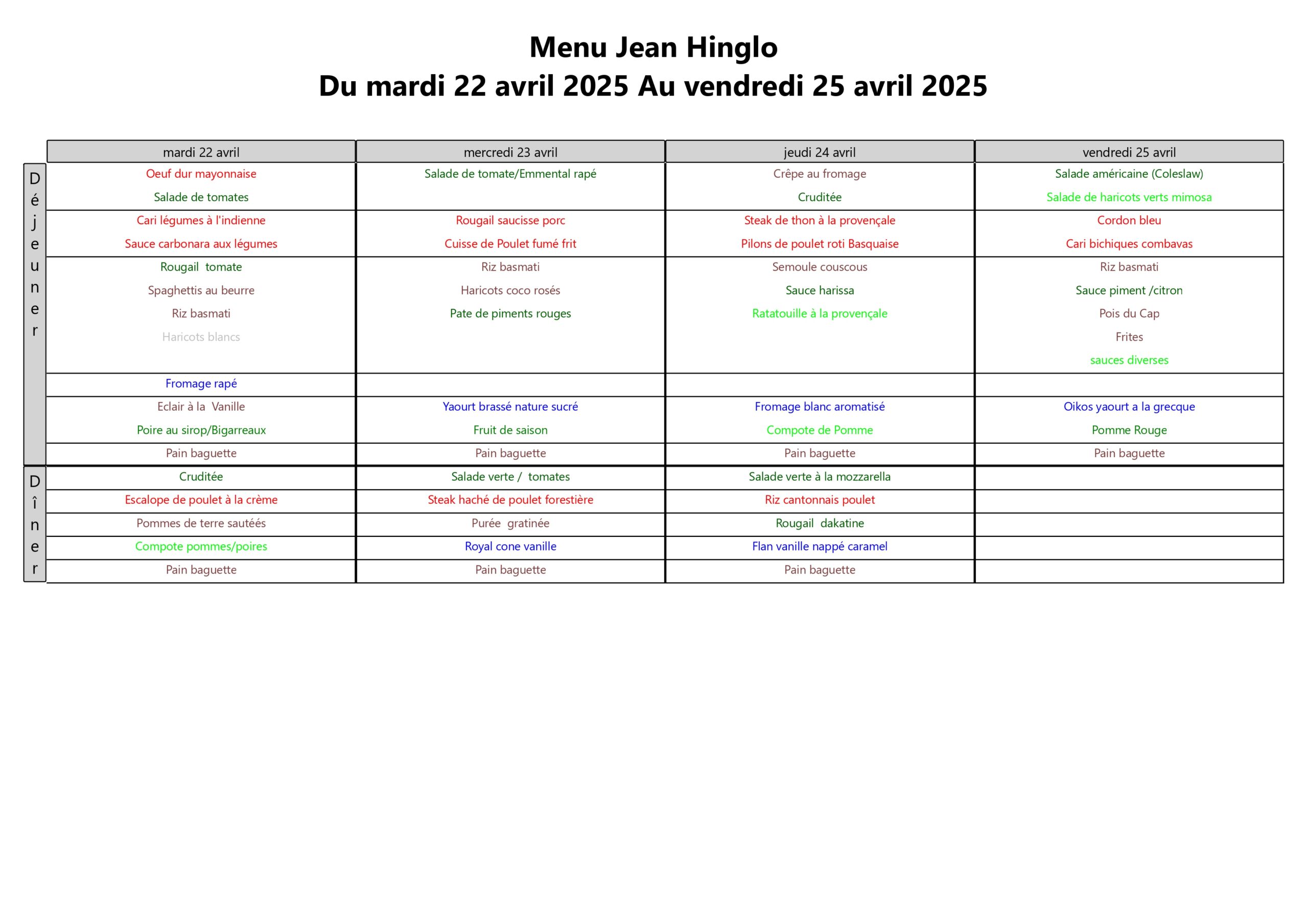 Restaurant scolaire : Menus du mardi 22 au vendredi 25 avril 2025