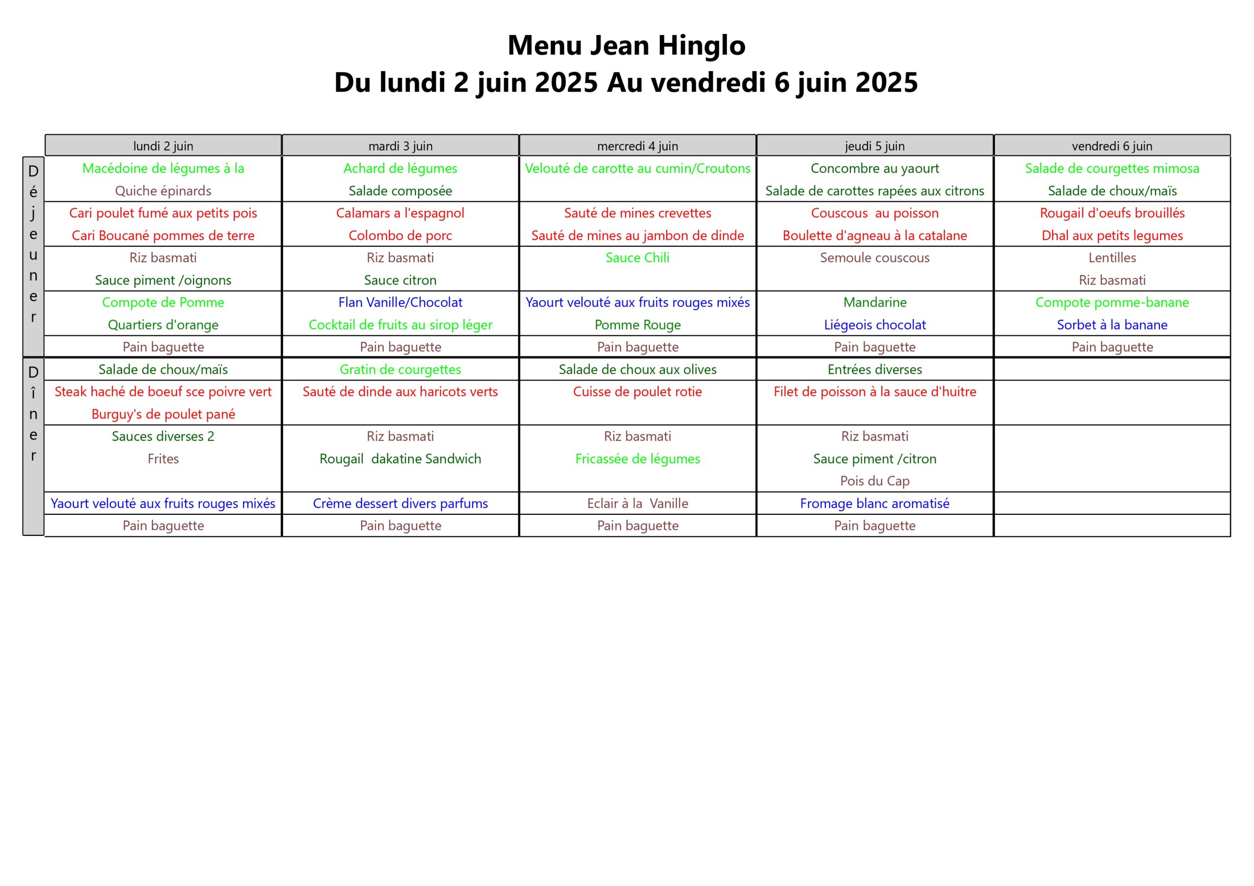 Restaurant scolaire : Menus du lundi 02 au vendredi 06 juin 2025