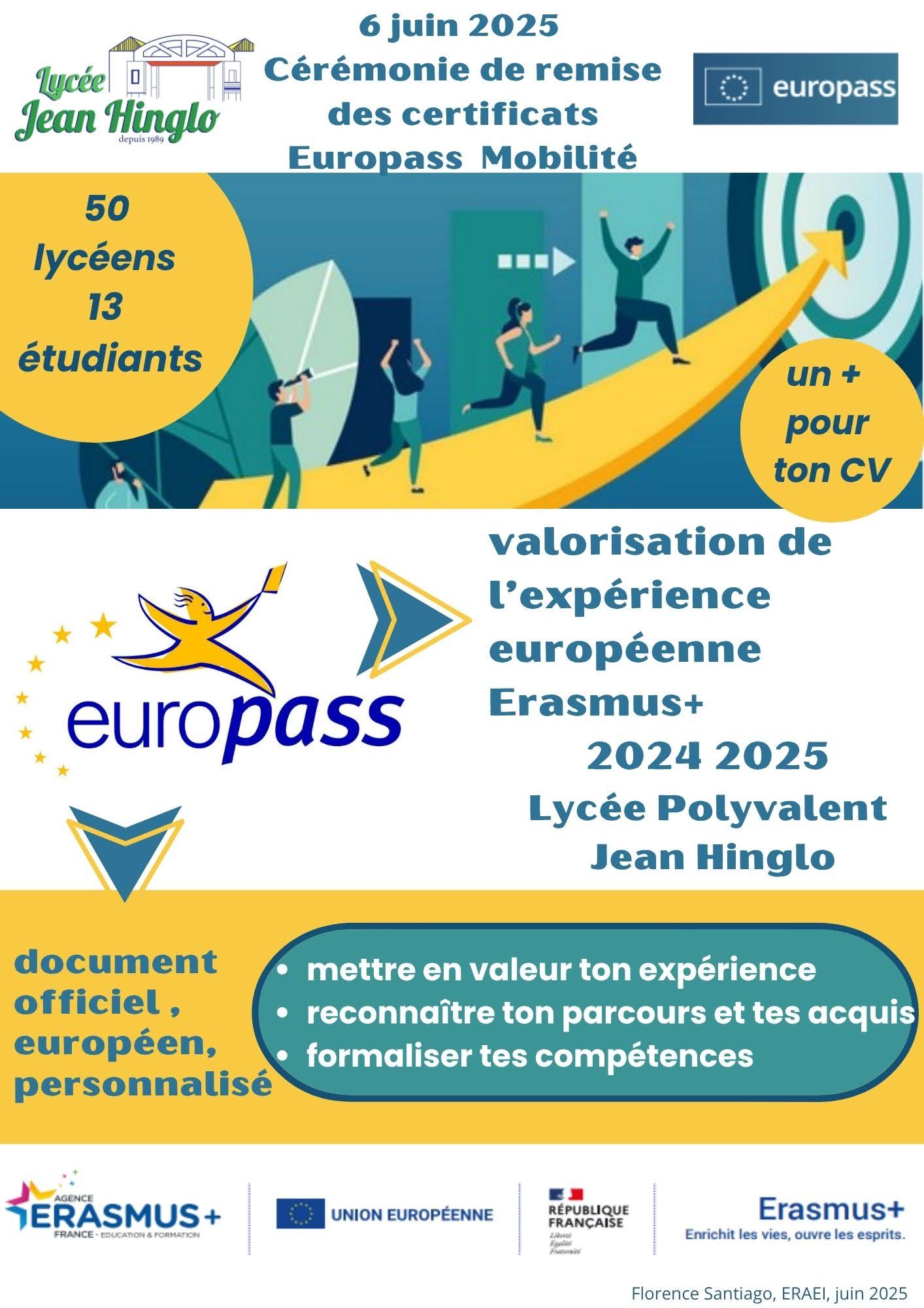 Le vendredi 6 juin 2025, le lycée Jean Hinglo a eu le plaisir de remettre les certificats Europass Mobilité à nos élèves et étudiants qui ont participé au programme Erasmus+;