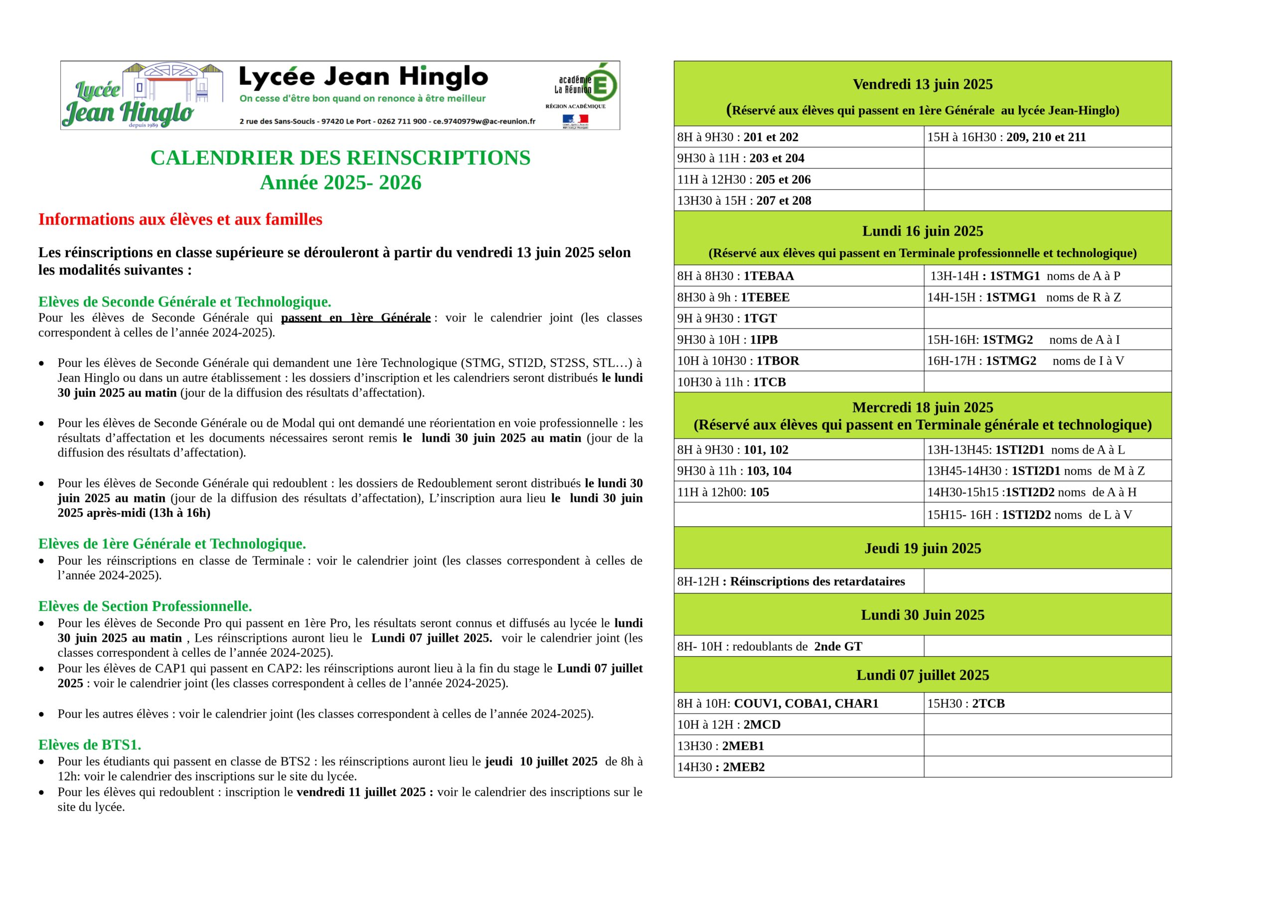 Calendrier des réinscriptions pour la rentrée 2025/2026