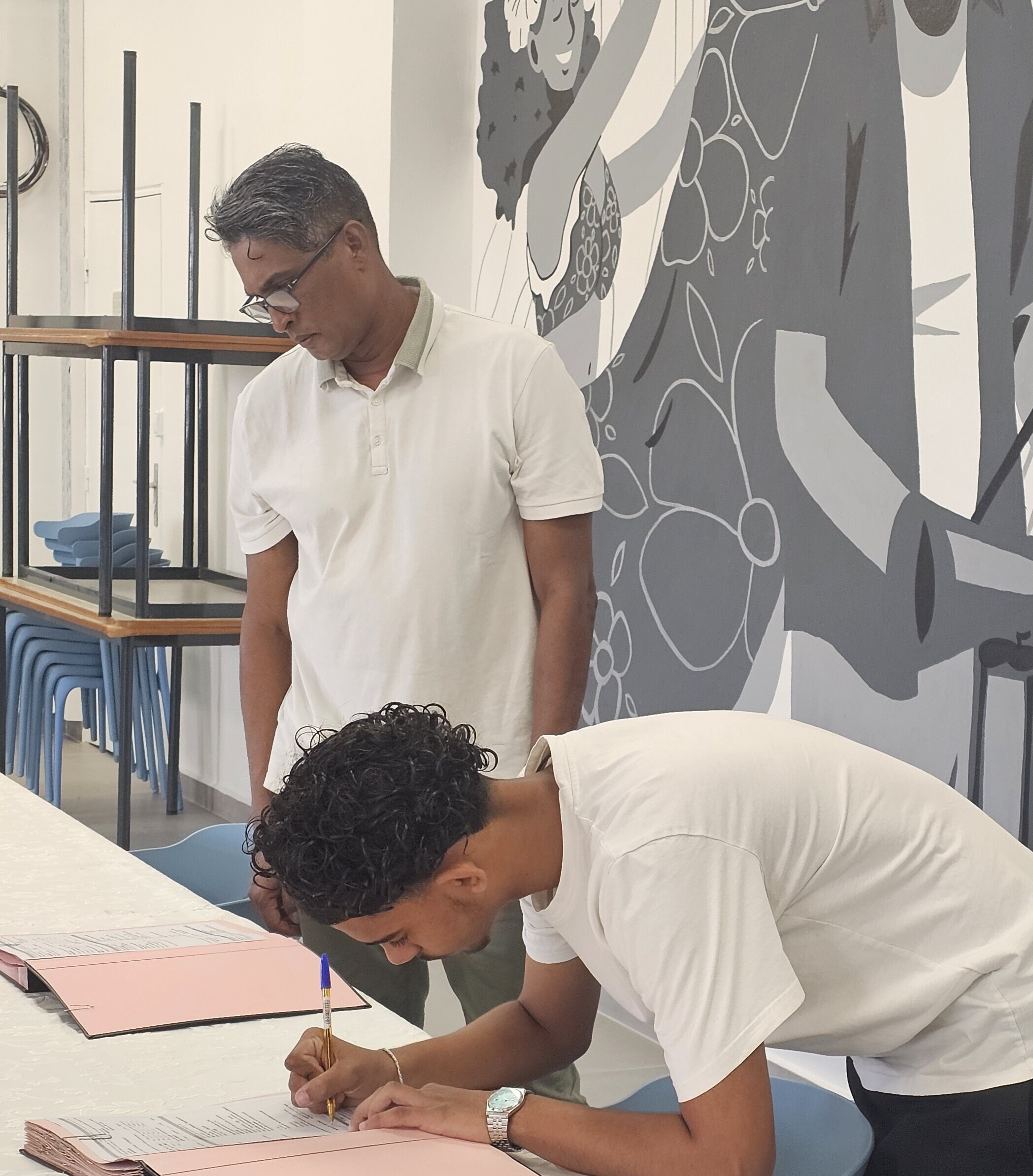 Dans la continuité du partenariat CEMENTIS / Lycée Jean Hinglo, ce vendredi 5 septembre 2025, deux élèves de Première Technicien du Bâtiment : Organisation et Réalisation du Gros Œuvre, ont eu l'honneur de signer leur contrat d’apprentissage en présence de la direction de l'établissement, de leur enseignant, des représentants du CFA Académique et de CEMENTIS.