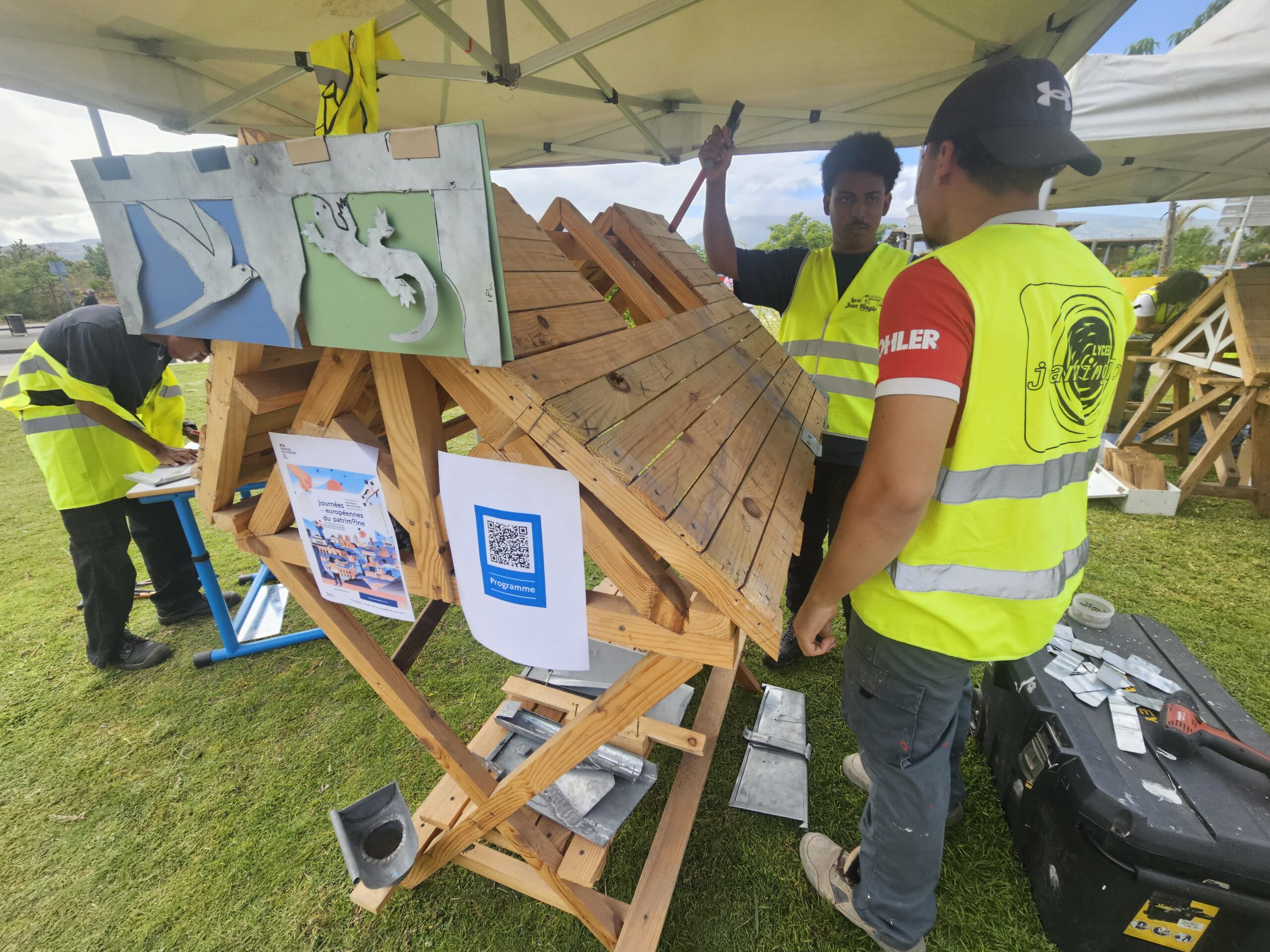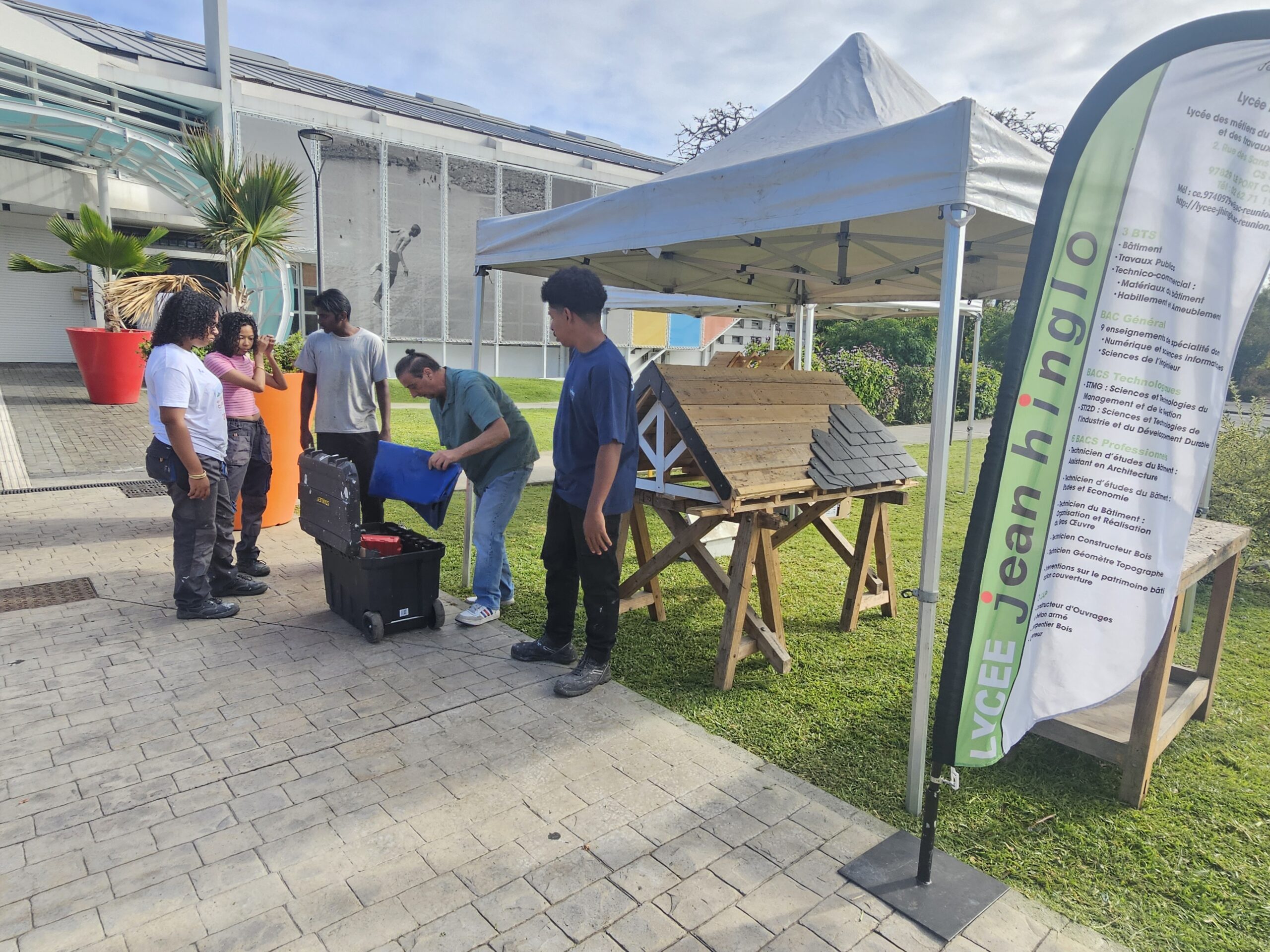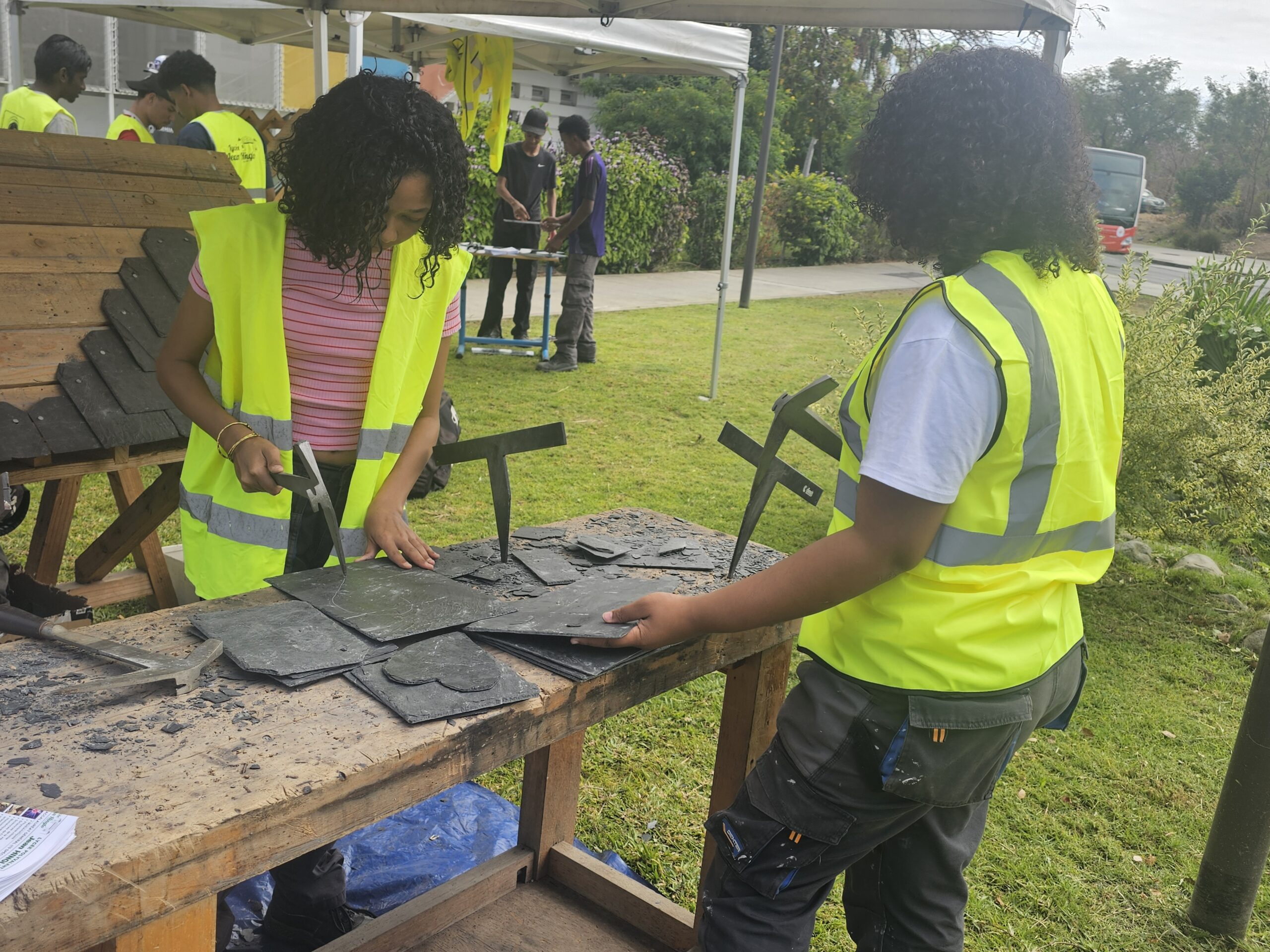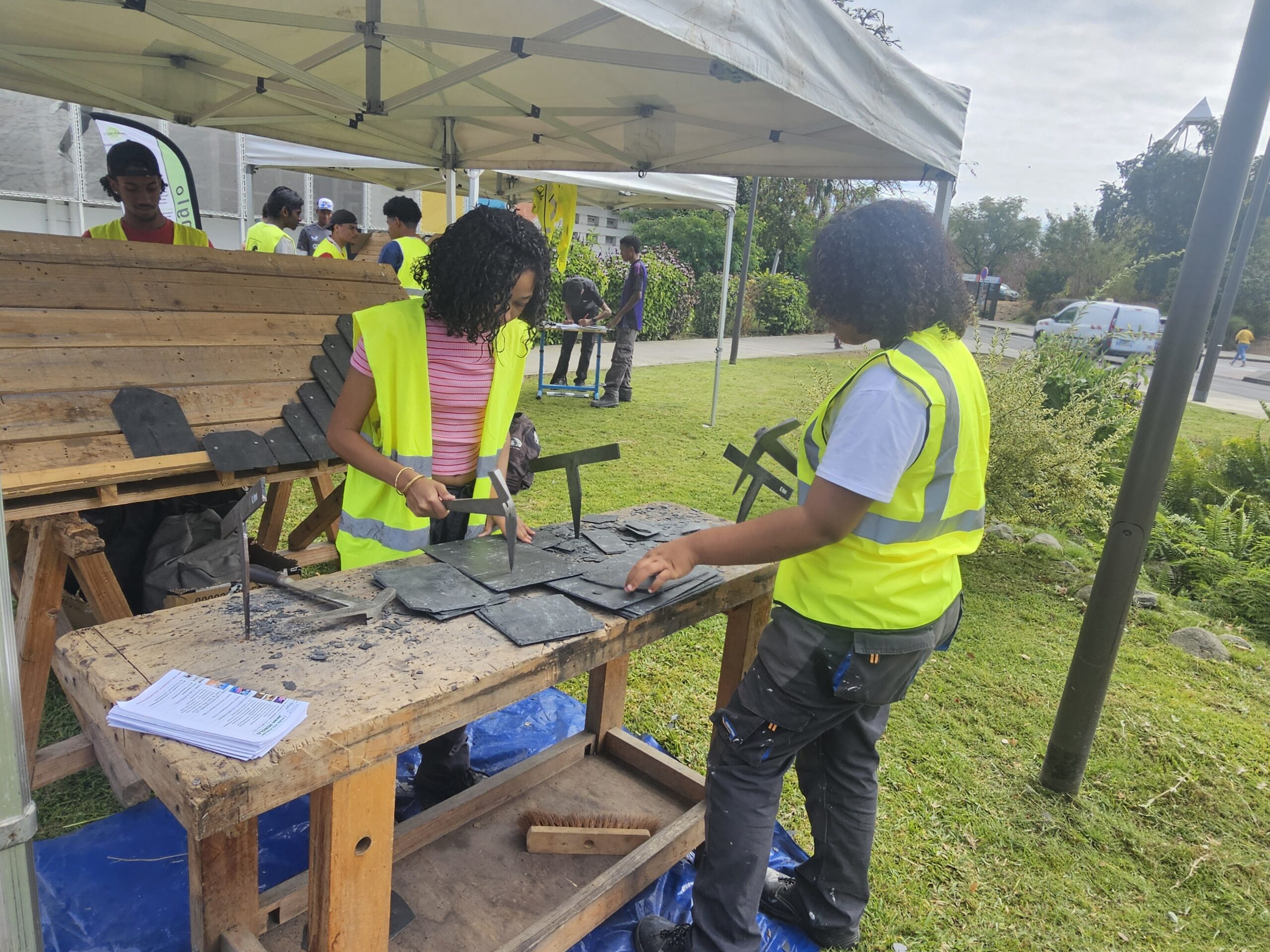 Vendredi 19 septembre 2025, à l’occasion des Journées européennes du patrimoine, les élèves de Terminale de la spécialité Intervention sur le Patrimoine Bâti du lycée Jean Hinglo ont réalisé une démonstration de couverture sur le parvis de la médiathèque Benoîte Boulard, au Port.