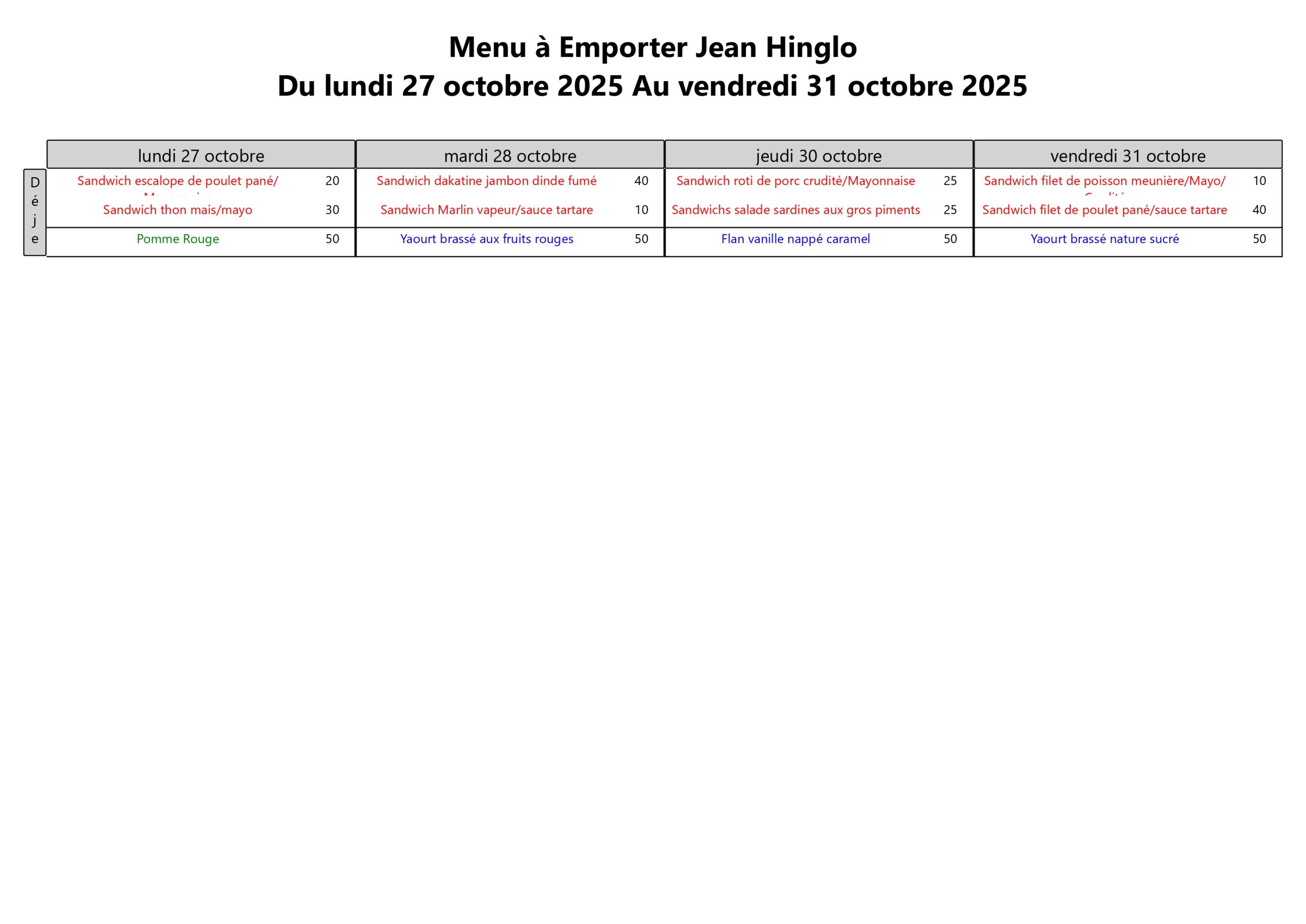 Formule cafétéria : Menu à emporter du lundi 27 au vendredi 31 octobre 2025