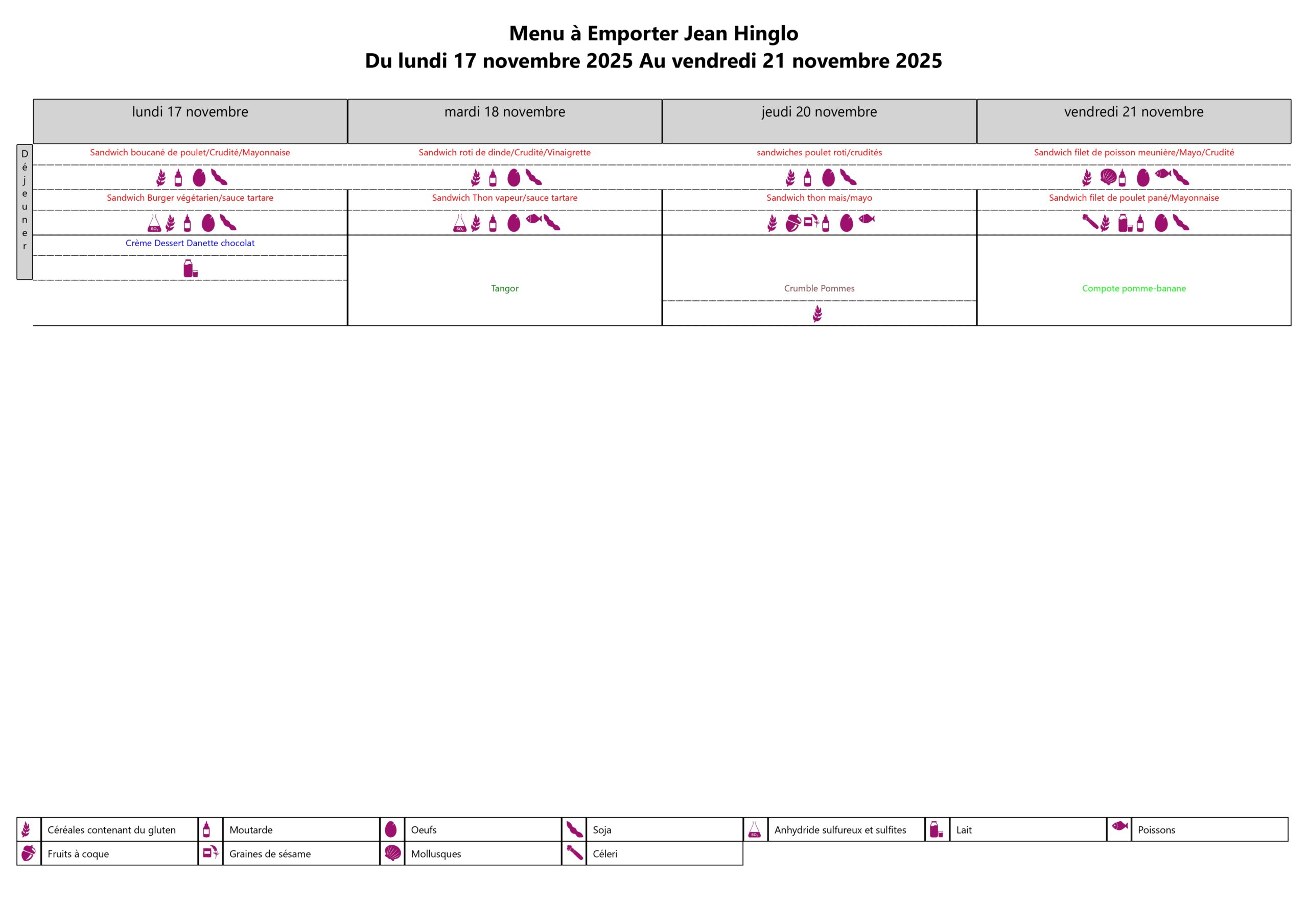 Formule cafétéria : Menu à emporter du lundi 17 au vendredi 21 novembre 2025