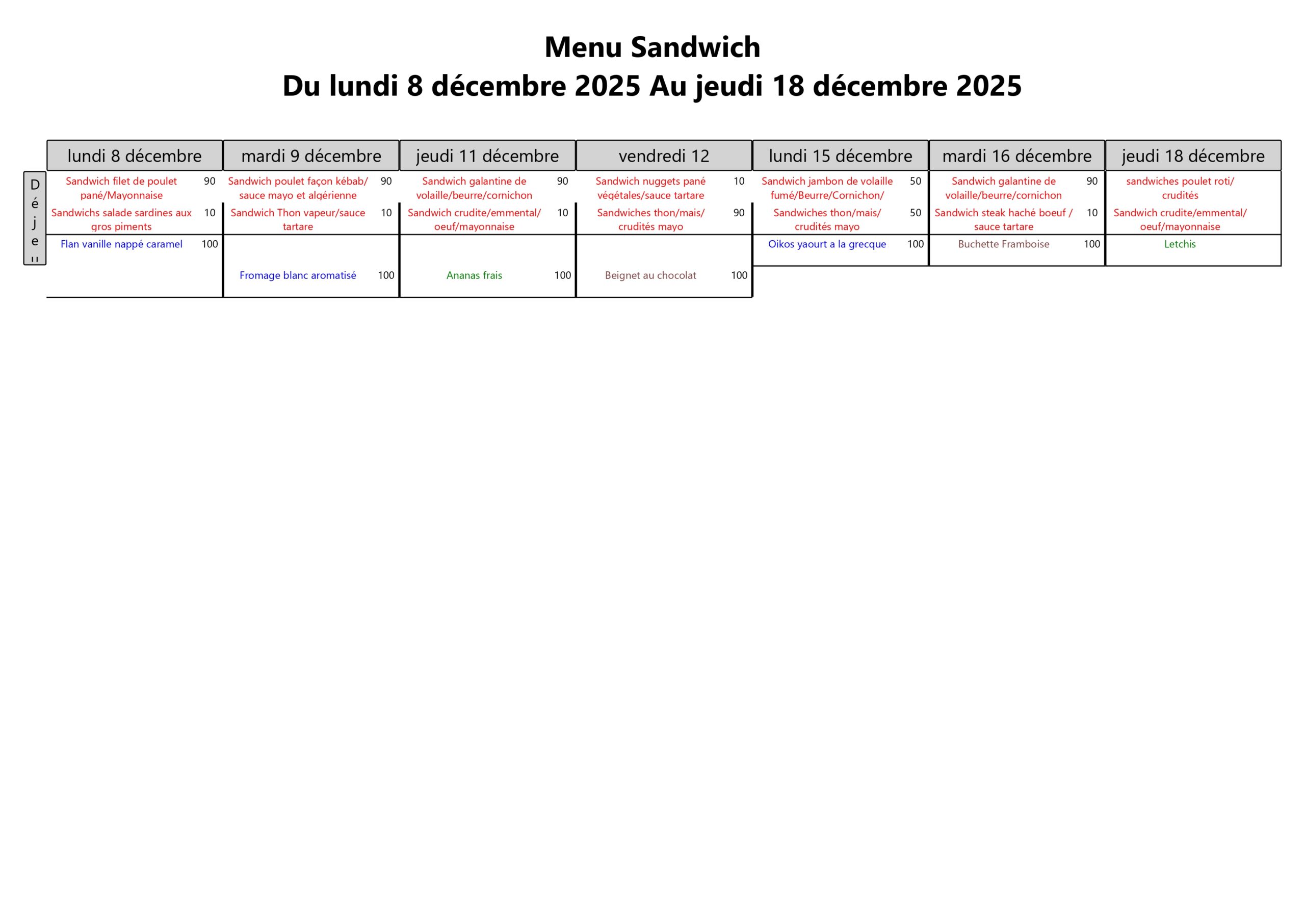 Formule cafétéria : Menu à emporter du lundi 08 au vendredi 19 décembre 2025