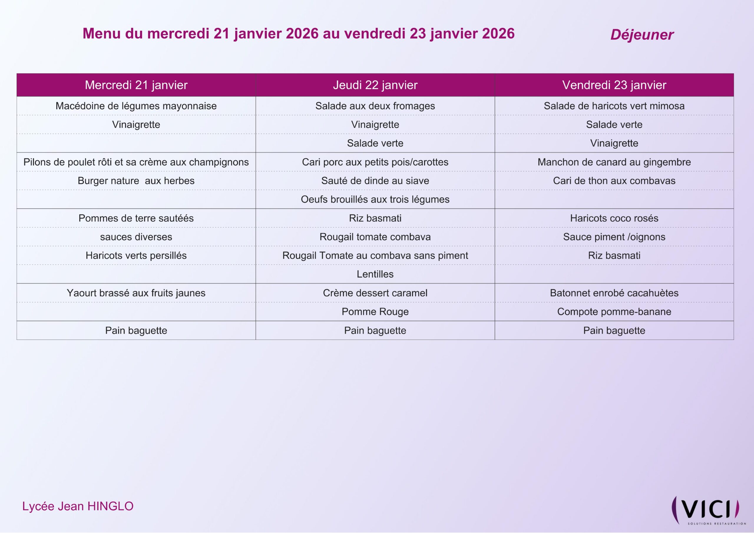 Accueil»Menus»Restaurant scolaire : Menus du mercredi 21 au vendredi 23 janvier 2026