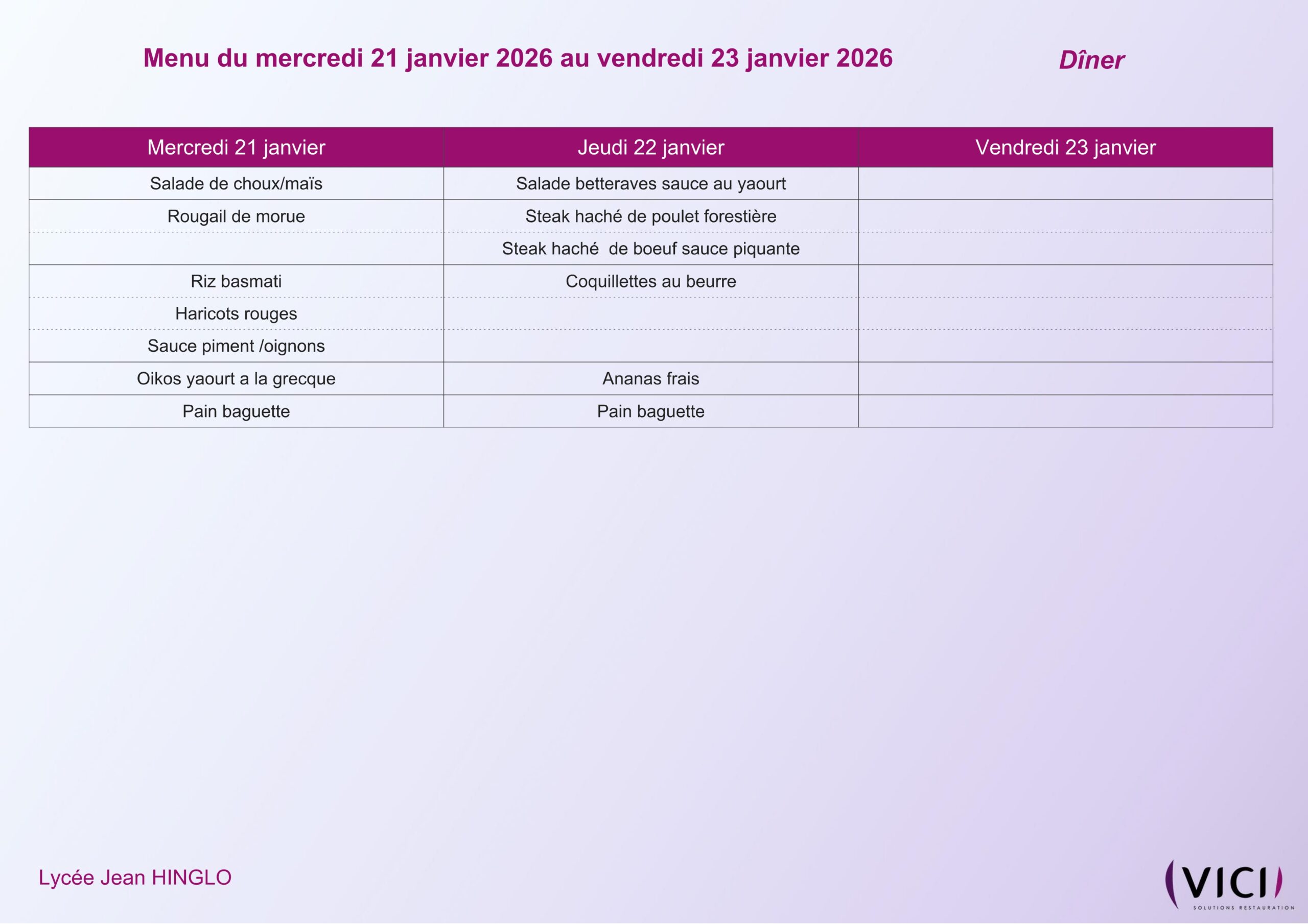 Restaurant scolaire : Menus du mercredi 21 au vendredi 23 janvier 2026