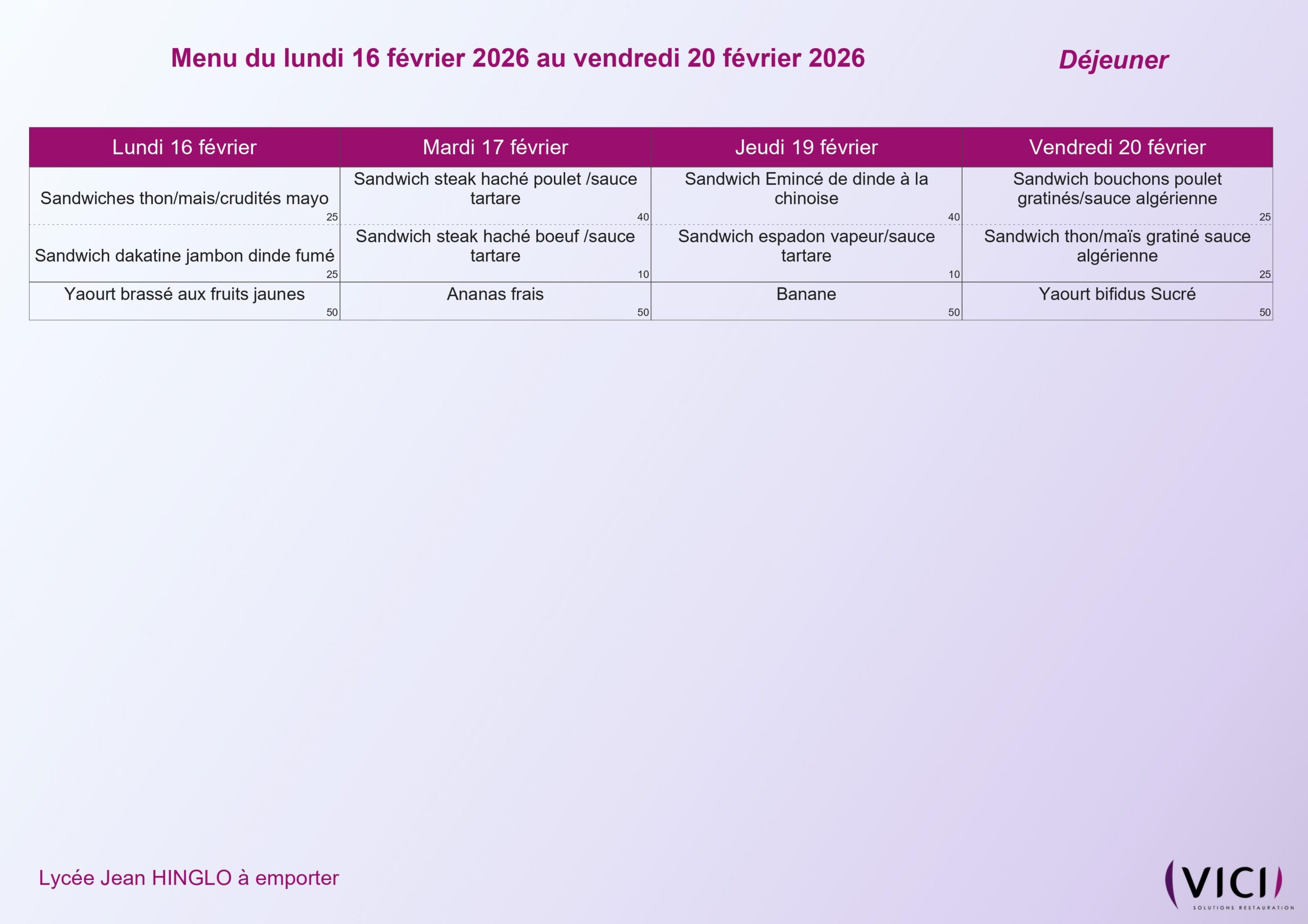 Les élèves demi-pensionnaires au forfait (DP 4 / DP 5 / INTERNES) ont la possibilité de prendre un repas froid (sandwich +dessert) pour le déjeuner (sauf le mercredi).