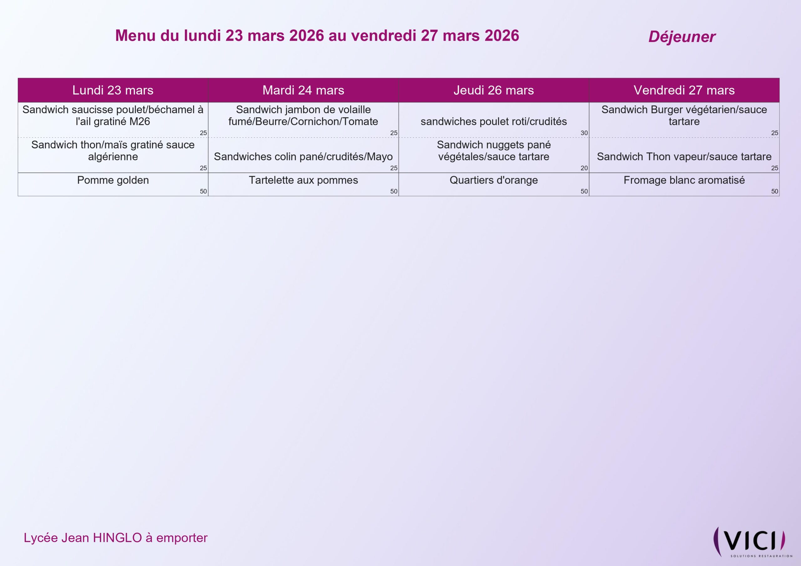Formule cafétéria : Menu à emporter du lundi 23 au vendredi 27 mars 2026