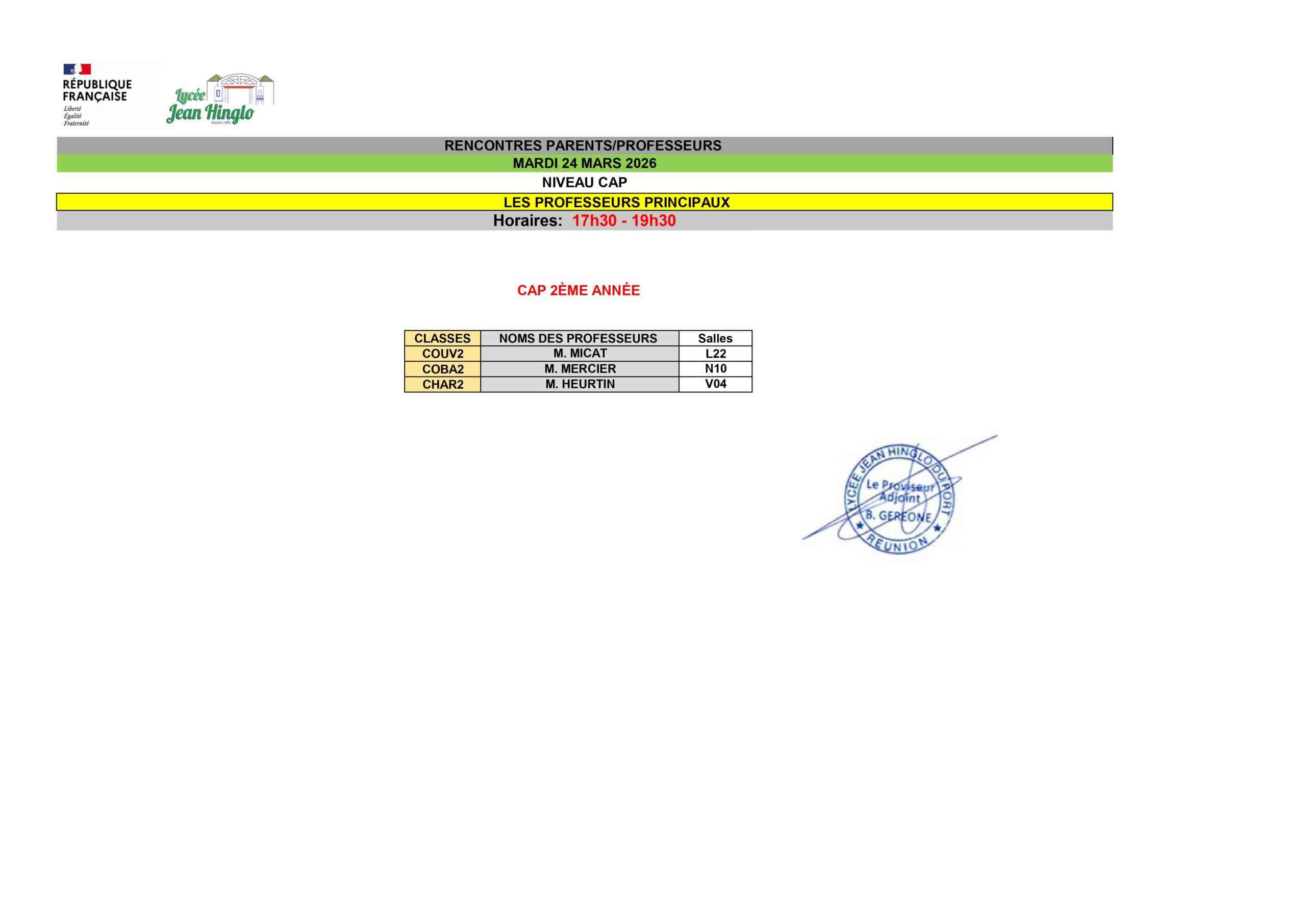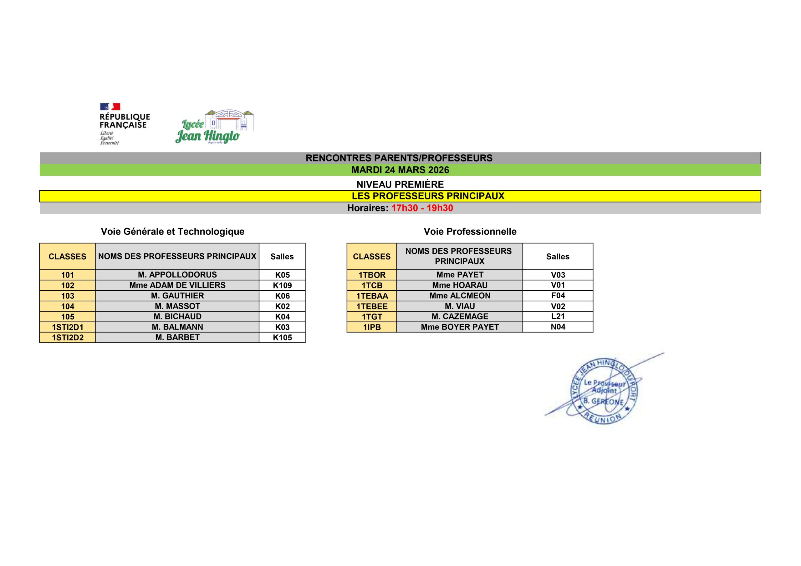 A cette occasion, les parents pourront s’entretenir avec les professeurs principaux, ainsi que les enseignants de l’équipe pédagogique, selon la répartition des salles ci-jointe et l’affichage sur place.