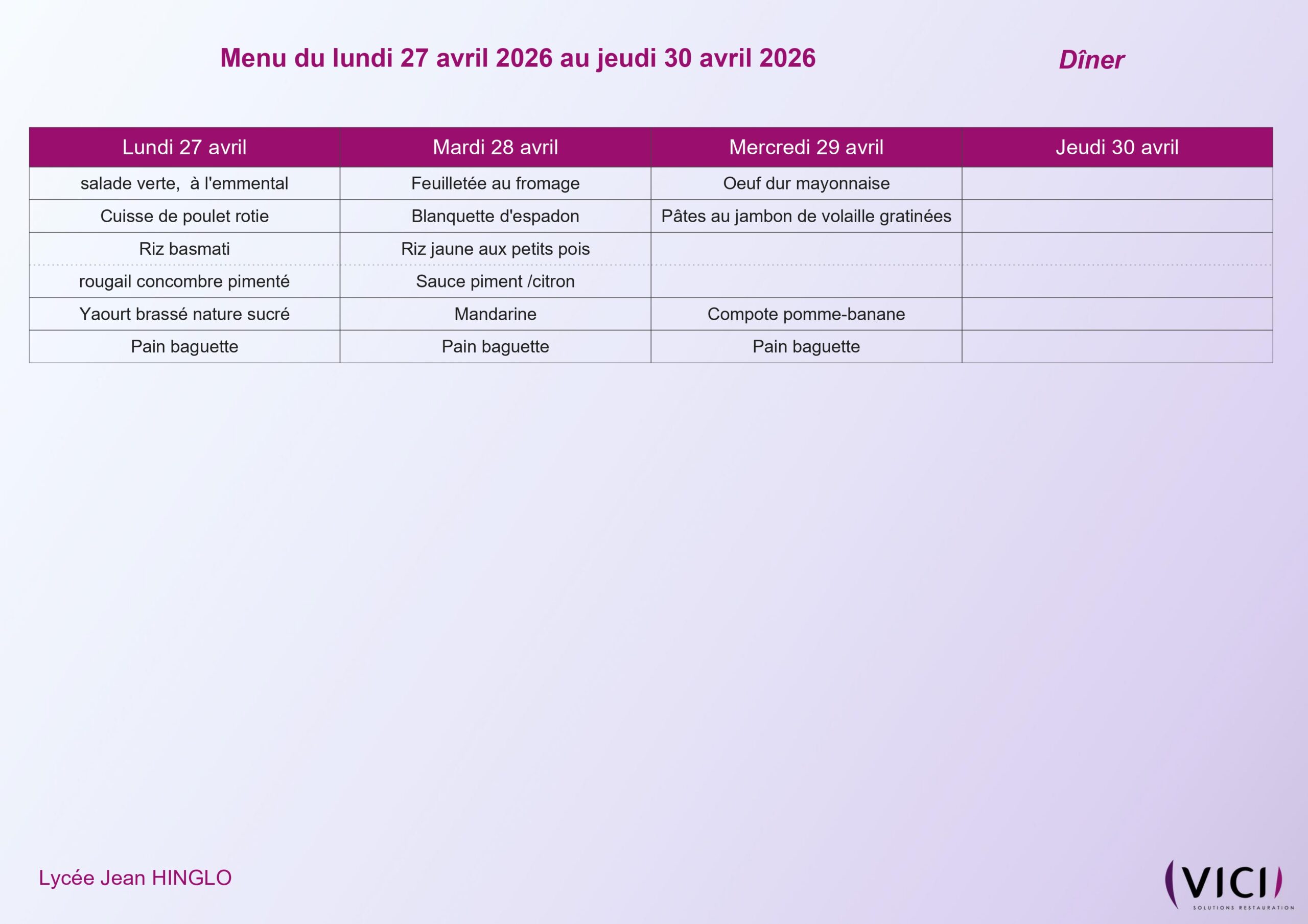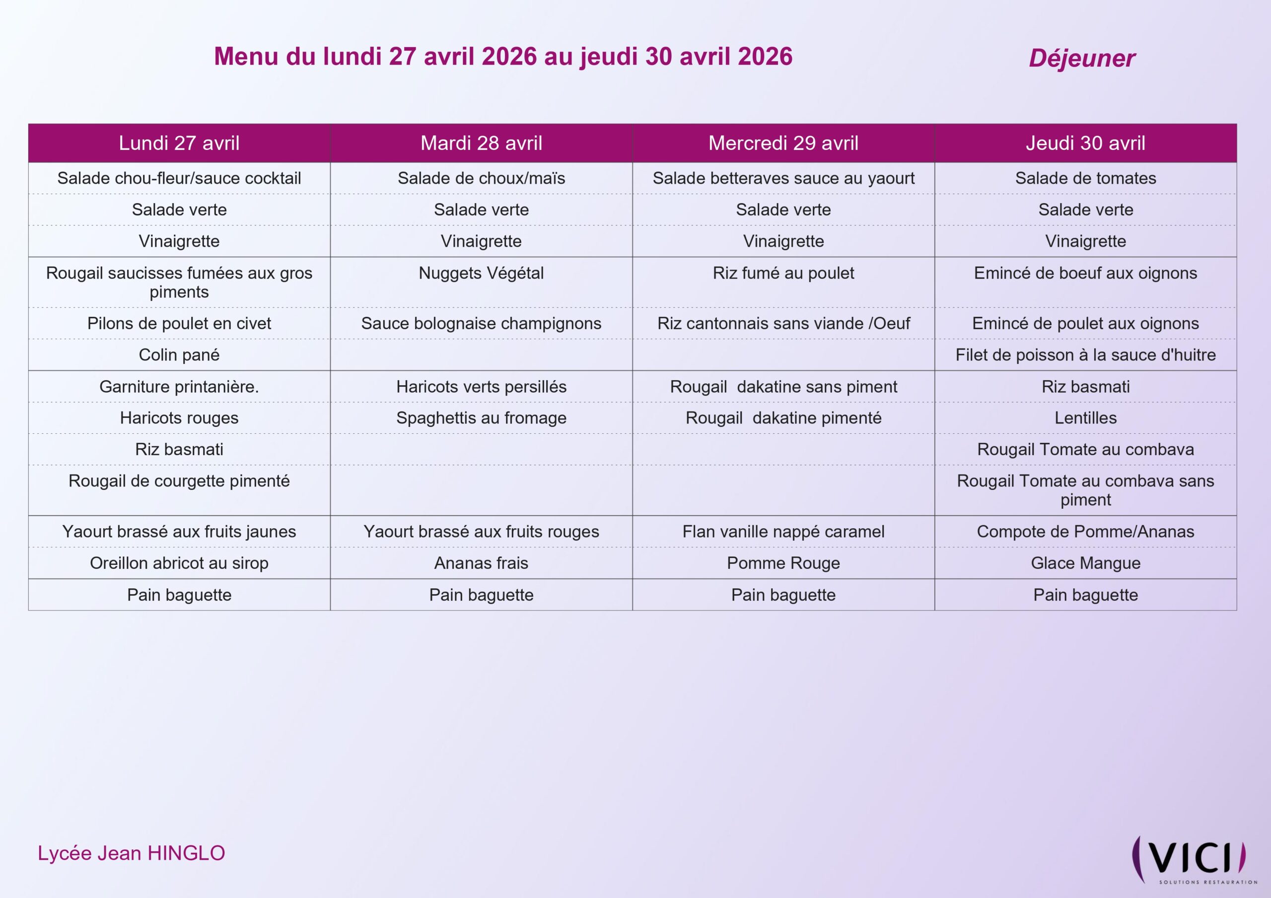 Accueil»Menus»Restaurant scolaire : Menus du lundi 27 au jeudi 30 avril 2026