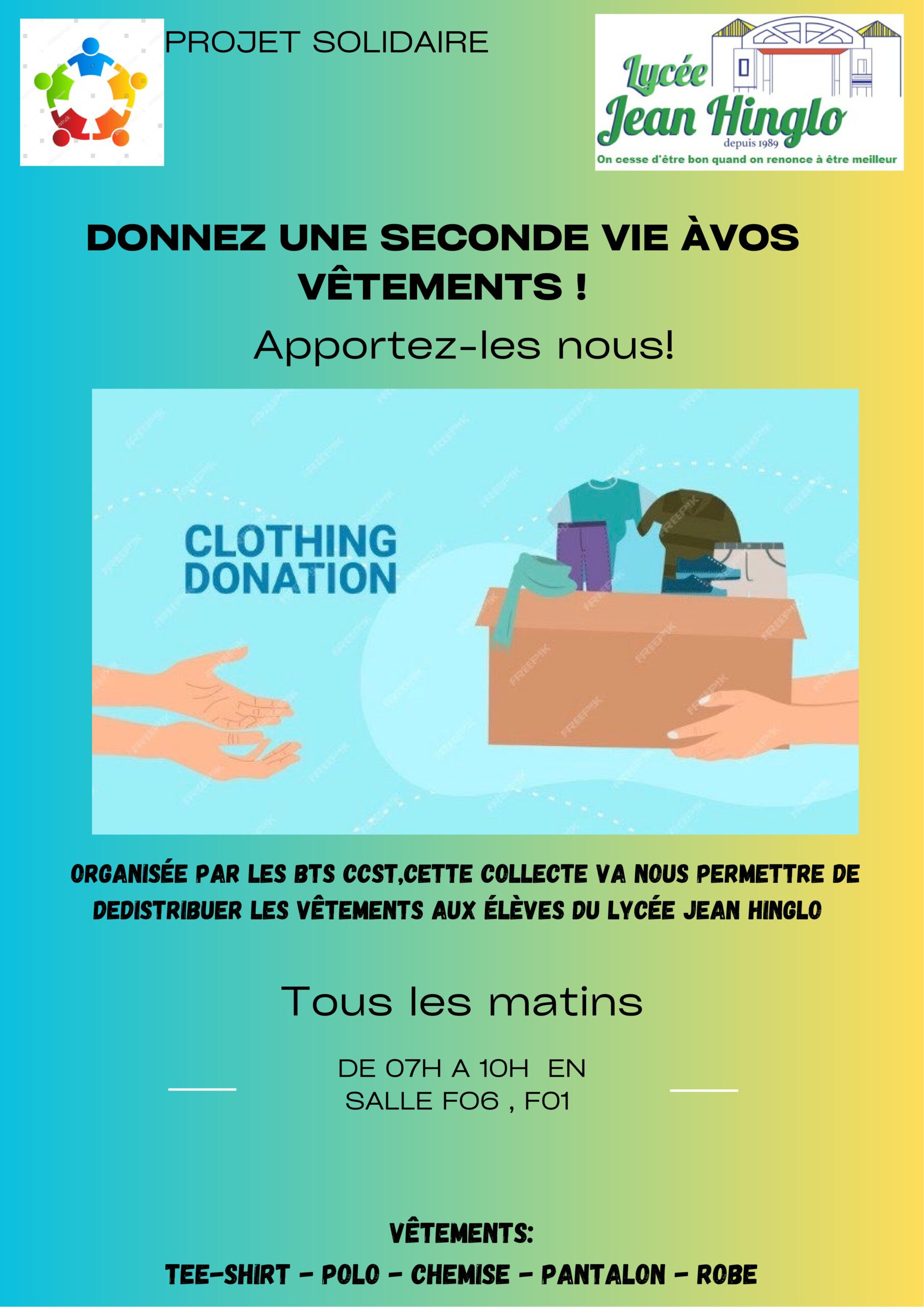 Dans le cadre de notre projet solidaire, les étudiants du BTS CCST du Lycée Jean Hinglo lancent une collecte de vêtements. L’objectif est simple : donner une seconde vie aux […]