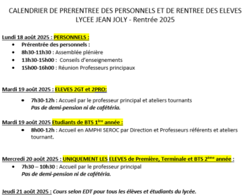 CALENDRIER DE PRERENTREE DES PERSONNELS ET DE RENTREE DES ELEVES   LYCEE JEAN JOLY – Rentrée 2025