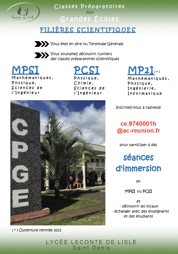 Les CPGE scientifiques du lycée Leconte de Lisle organisent cette année des séances d’immersion en MPSI/MP2I/PCSI à destination principalement des élèves de Premières Générales faisant les spécialités Mathématiques et Physique-Chimie et à destination des élèves de Terminales Générales faisant la spécialité Mathématiques et l’une des spécialités Physique-Chimie, SI ou NSI.