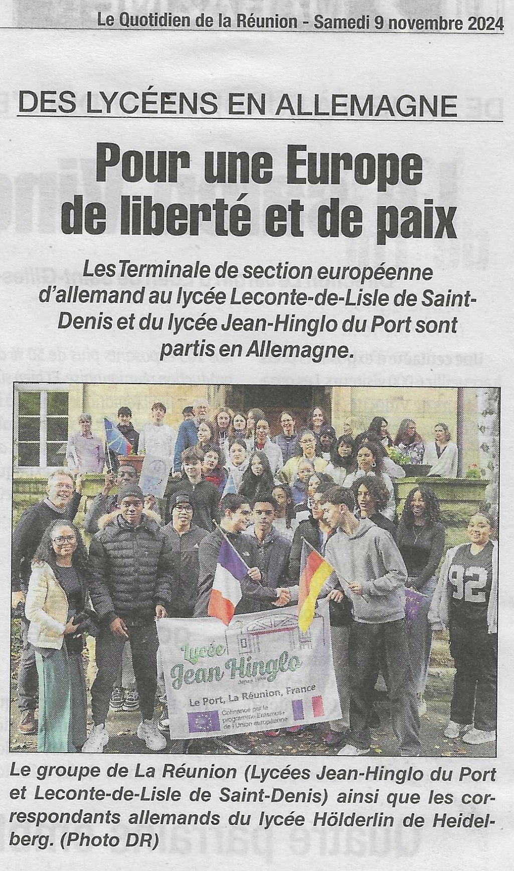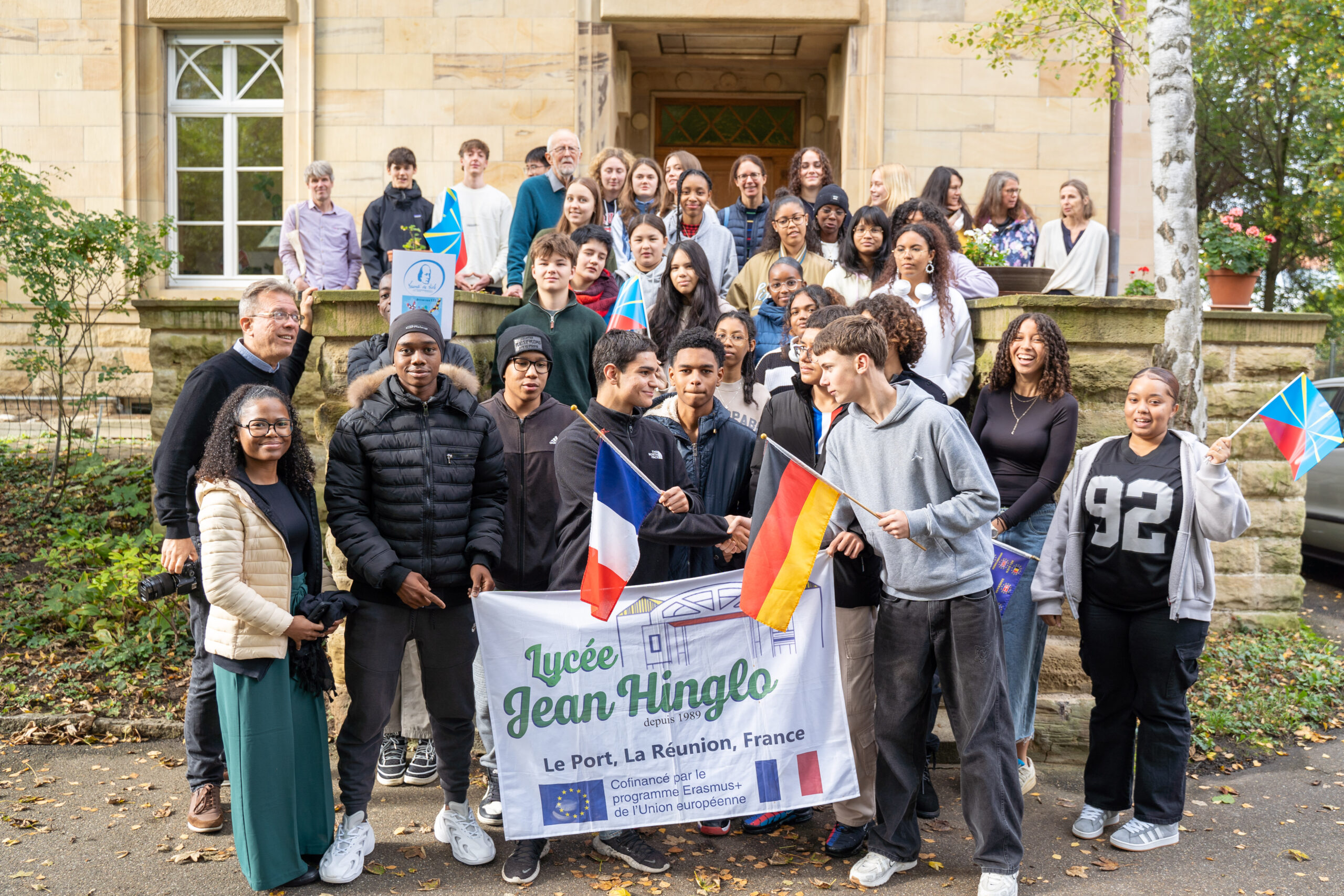 Du 11 au 20 octobre 2024, 4 élèves de terminale du Lycée Leconte de Lisle se sont rendus en Allemagne avec des élèves du lycée Jean Hinglo. Ils ont été accueillis pour cette mobilité Erasmus par le lycée Hölderlin de Heidelberg. Un moment fort de cette mobilité a été leur rencontre avec Manfred Kaut,un Monsieur de 83 ans, témoin du passé et du discours que le Général de Gaulle a prononcé à la jeunesse allemande le 9 septembre 1962 au Château de Ludwigsburg. Cette mobilité a débouché sur un projet plus vaste de véritable échange dont les objectifs pédagogiques ont été primés par le Prix Hippocrène de l’Education à l’Europe 2025.