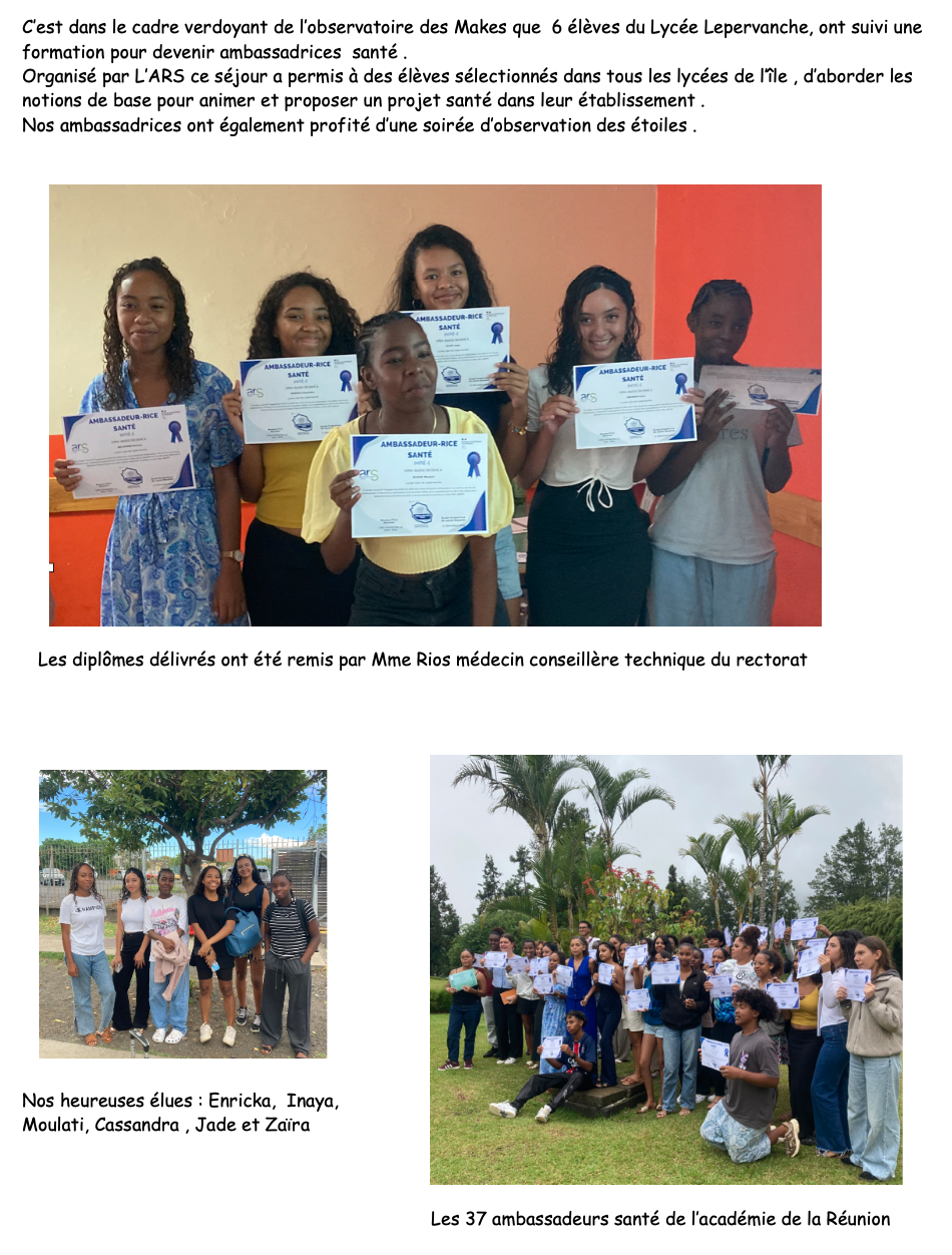 AMBASSADRICES SANTE par Virassamy | Déc 16, 2025 | Actualités | 0 commentaires C’est dans le cadre verdoyant de l’observatoire des Makes que 6 élèves du Lycée Lepervanche, ont suivi une formation pour devenir ambassadrices santé.