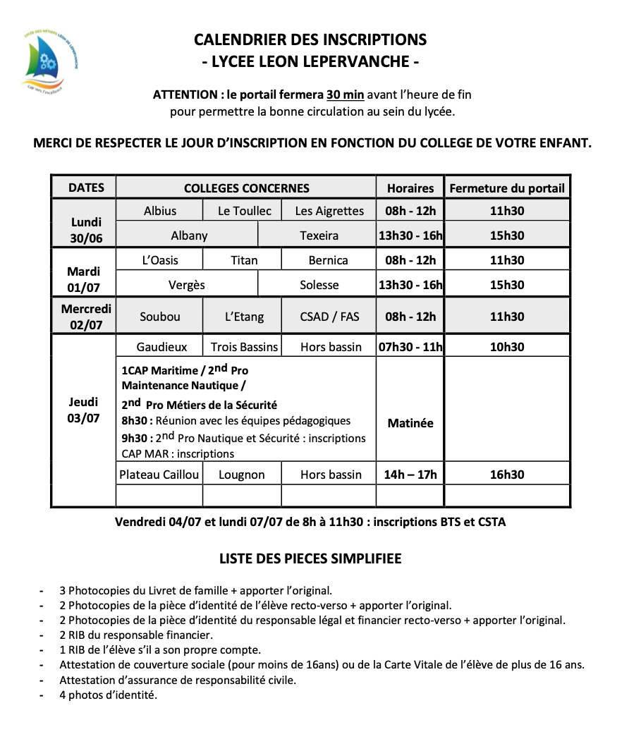 CALENDRIER DES INSCRIPTIONS par Virassamy | Juin 12, 2025 | Actualités, Informations | 0 commentaires MERCI DE RESPECTER LE JOUR D’INSCRIPTION EN FONCTION DU COLLEGE DE VOTRE ENFANT. CALENDRIER DES INSCRIPTIONS 25-26 VD