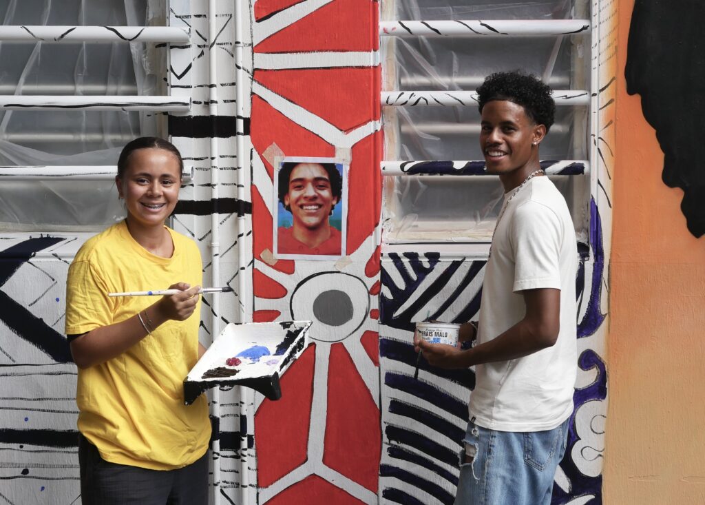 Deux visages, côte à côte, sont apparus au fil des semaines, entourés de fleurs et d’arabesques, et de messages d’espoir; au-dessus, une nouvelle devise républicaine qui représente notre lycée: Liberté, égalité, adelphité.
