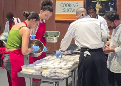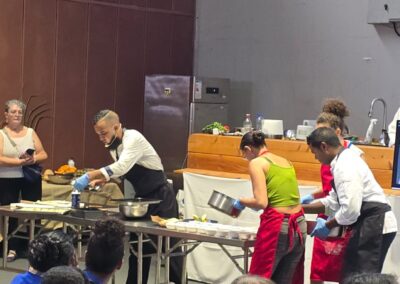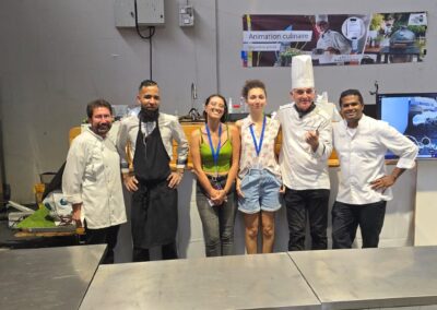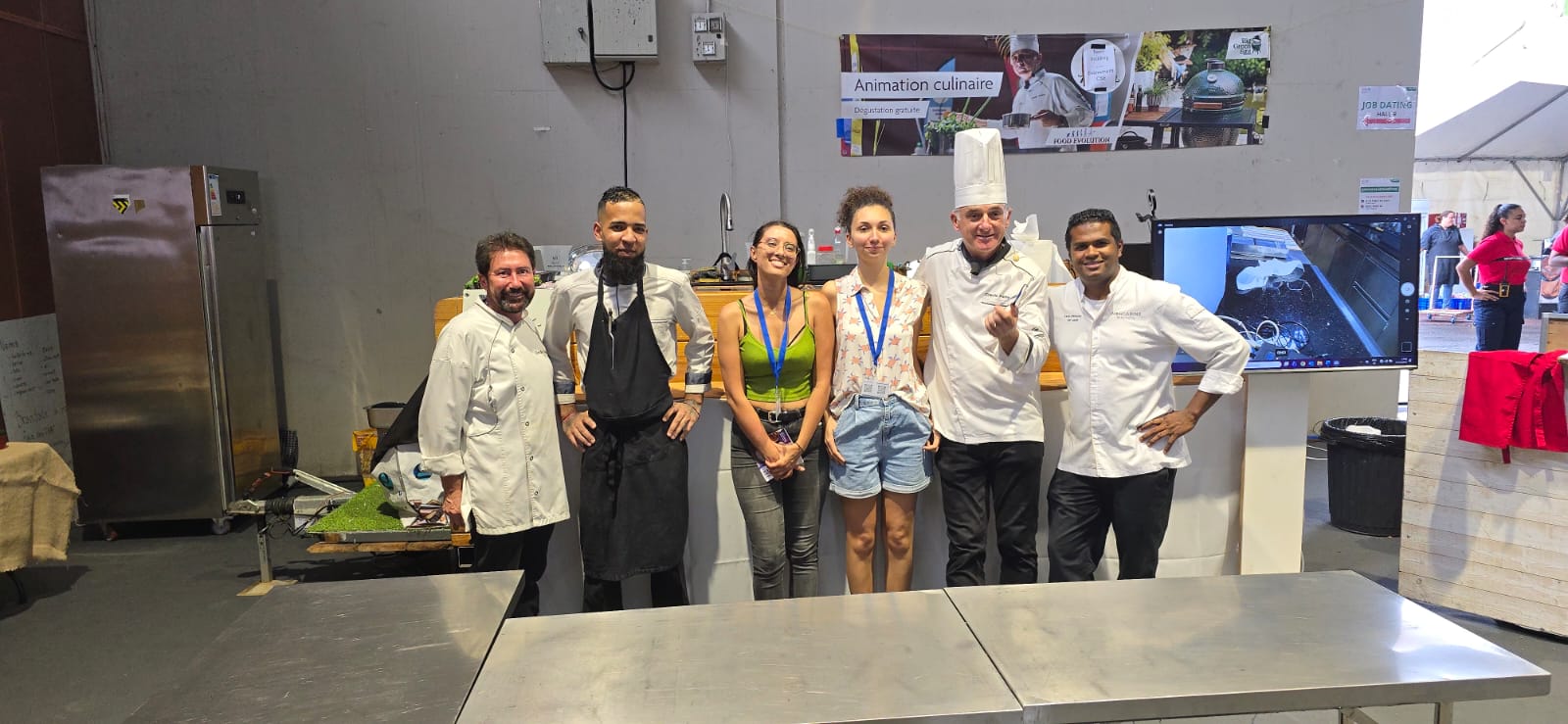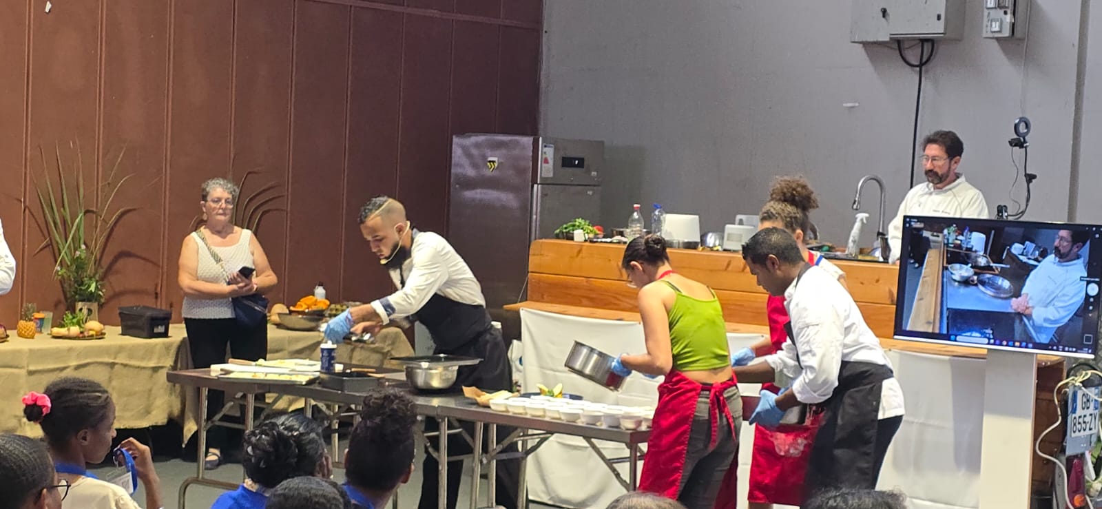 Quatre étudiants, accompagnés de deux chefs, ont animé un atelier pratique de préparations culinaires enrichies.