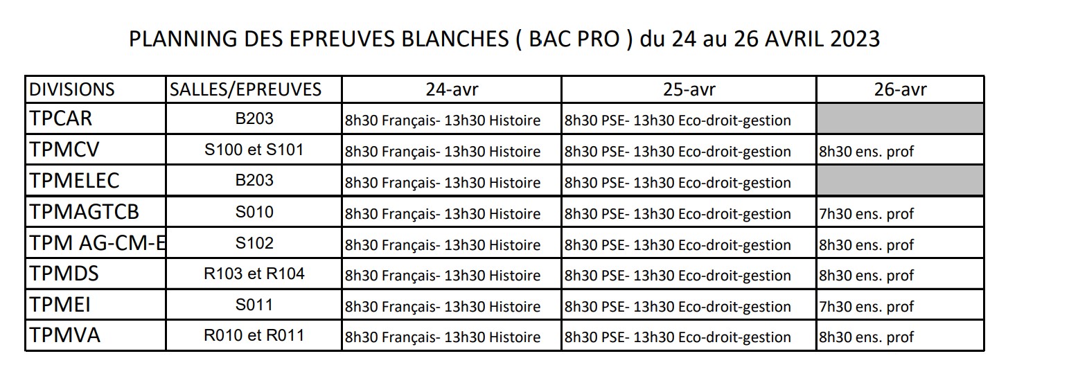 planning epreuves blanches BAC PRO