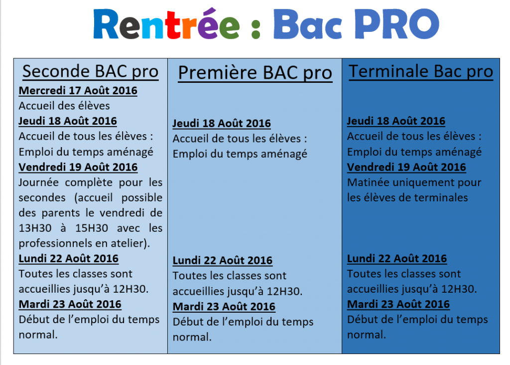 rentrée bac PRO