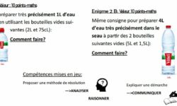 Enigme 2 du 7 au 14 février (Cliquer ici pour l’énoncé) Pour cette semaine: L’énigme de cette semaine consiste à obtenir un volume précis d’eau dans le seau en transvasant plusieurs fois l’eau d’une bouteille à une autre de façon intelligente. Aucune approximation (repérer à peu près la moitié, ou…