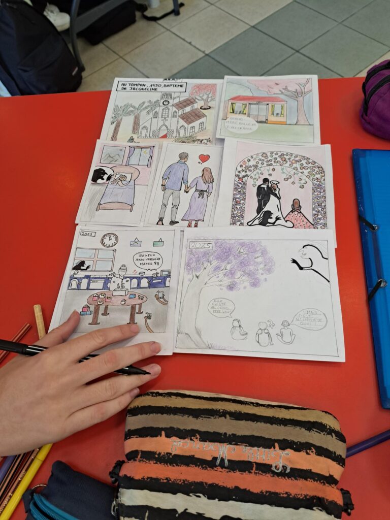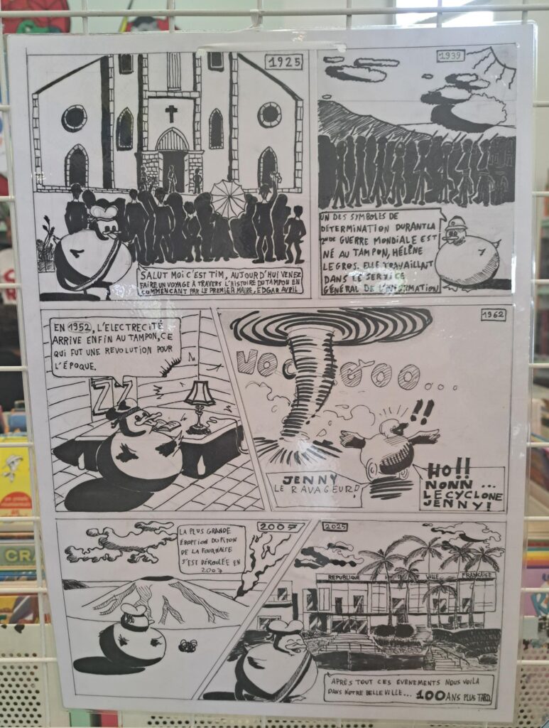 J’ai aimé créer les planches de BD pour qu’elles correspondent au thème imposé : les 100 ans de la commune du Tampon. Le travail en groupe m’a plu même si c’était compliqué par moments car il fallait se mettre d’accord sur les idées et sur les vignettes de la BD. Créer un bande dessinée nécessite une bonne organisation au sein du groupe, de la créativité et un certain talent de dessinateur. Pour ma part, j’ai découvert qu’on pouvait faire passer des messages clairs rien qu’avec des images.