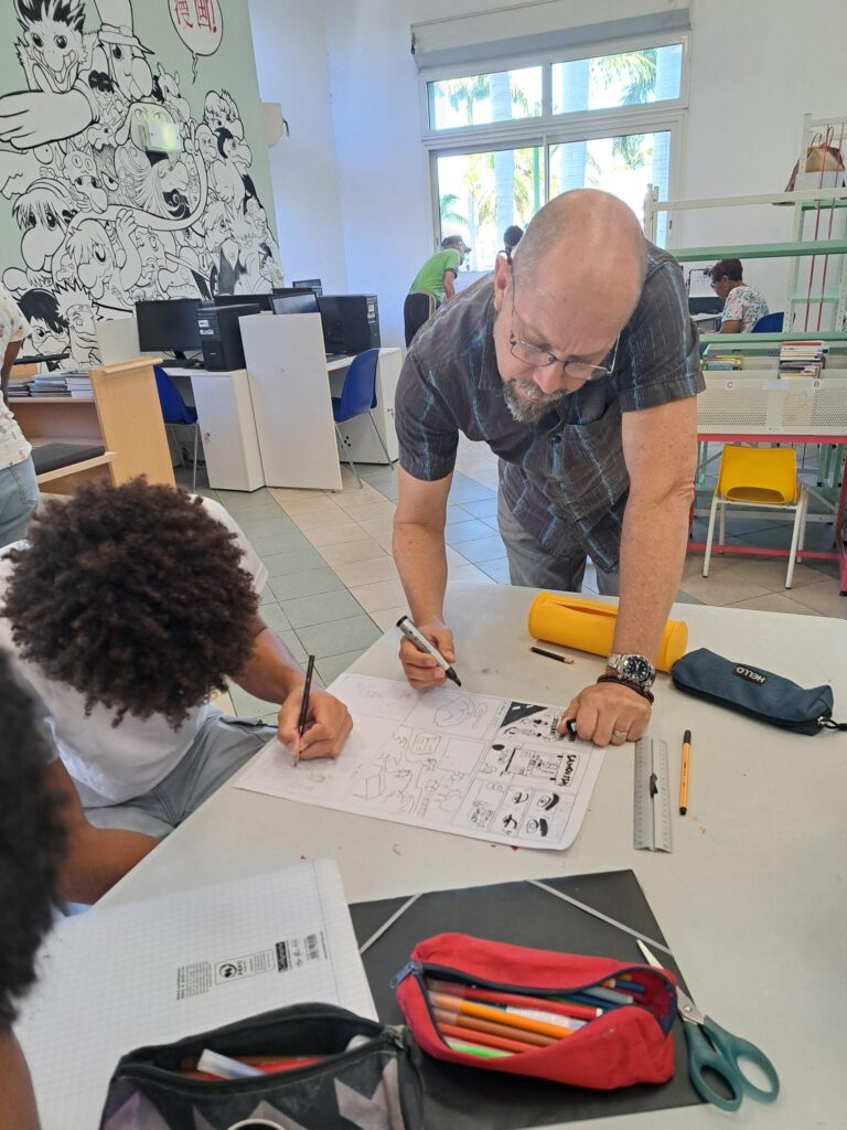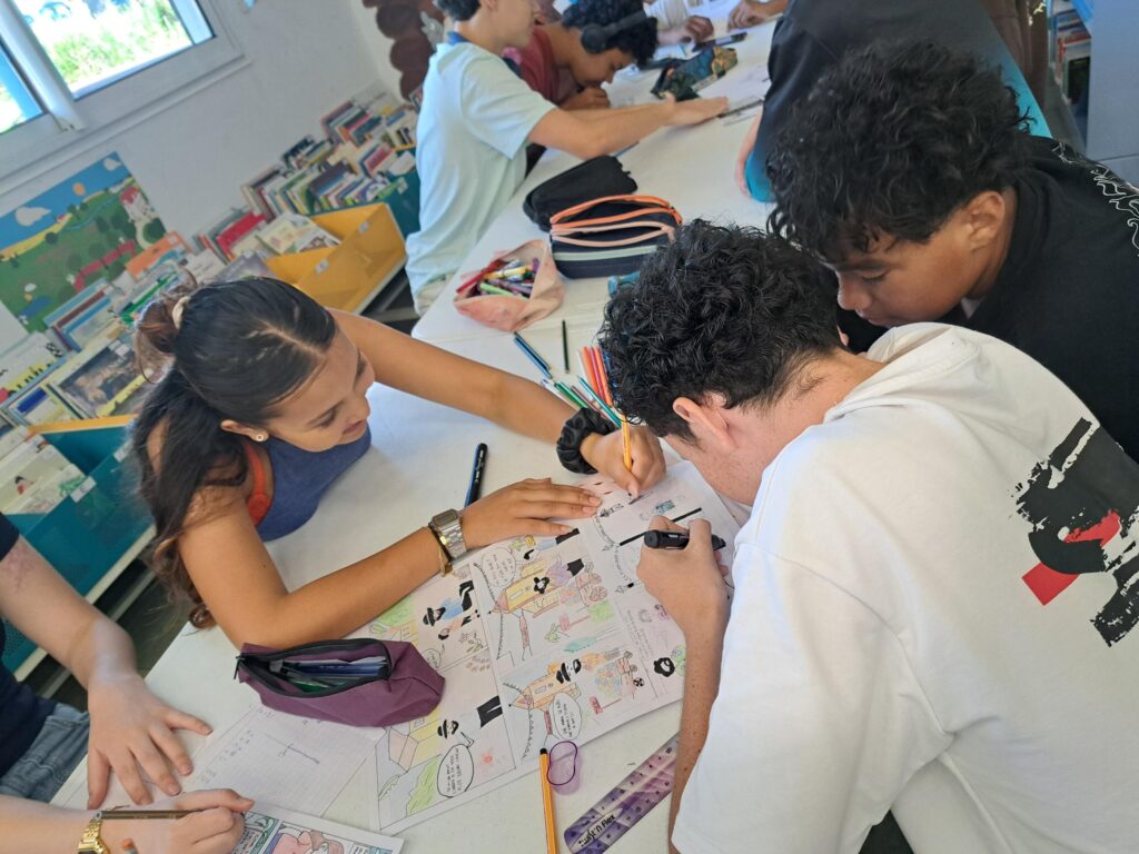 Première séance de l’atelier BD à la bédéthèque de Trois-Mares et présentation du projet : dessiner des planches de bande dessinée sur le thème du centenaire de la ville du Tampon… en une huitaine d’heures seulement.