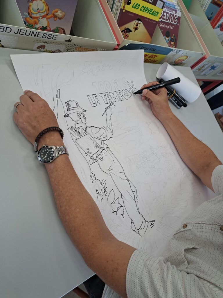 Olivier Giraud crée l’affiche de la journée de l’exposition. Vendredi 28 novembre, c’est le grand jour : les planches BD de la classe sont exposées à la bédéthèque, qui nous reçoit pour une matinée festive.