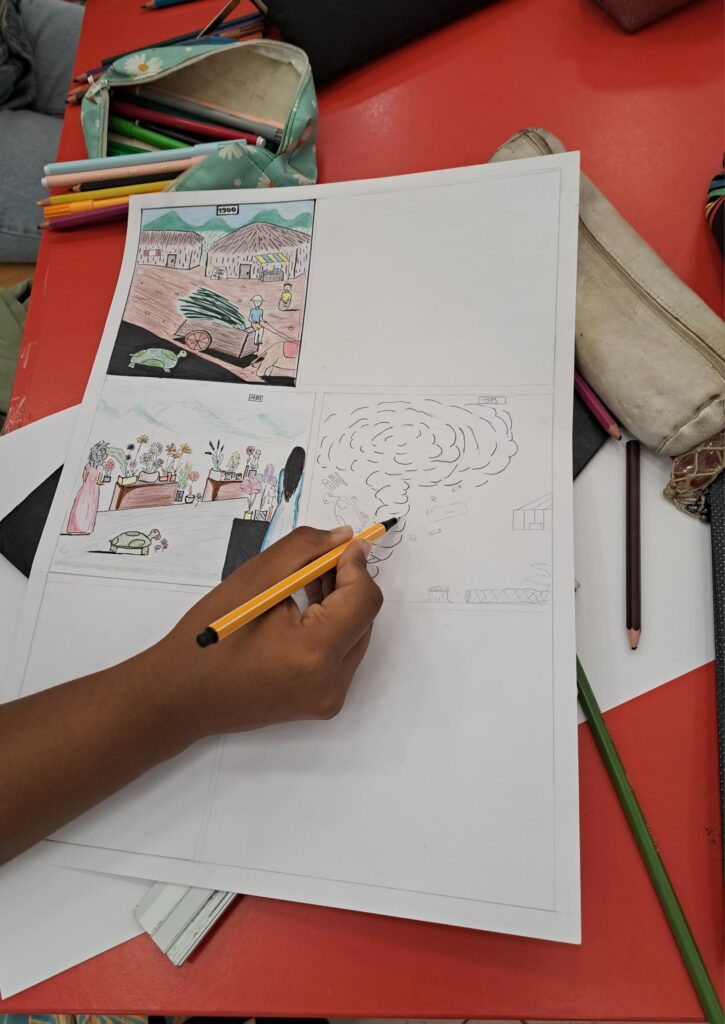J’ai bien aimé l’atelier BD car c’était différent des cours habituels. J’ai appris comment construire une petite histoire et faire des cases qui se suivent bien pour la raconter. Travailler en groupe était important pour s’entraider quand on bloquait. Notre BD parle des 100 ans du tampon et on s’est partagé les vignettes : moi j’ai illustré la première fois que l’électricité est arrivée dans la ville du tampon ; un de mes camarades a dessiné l’époque du premier maire du Tampon, M. Edgar AVRIL ; un autre a travaillé sur le cyclone de 1962. Le plus facile, c’était d’imaginer l’histoire. Pour les dessins, tout le monde a eu un peu de mal au début mais on a fini par y arriver. Ce projet était incroyable, j’ai beaucoup aimé et j’ai beaucoup apprécié l’aide de M. GIRAUD et l’accueil de la médiathèque.