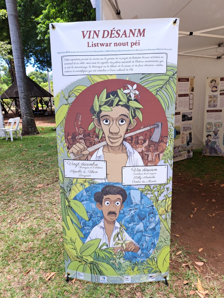 Nous avons également visité l’exposition dédiée à la bande dessinée Vingt Désanm, le dernier album de Téhem, toujours en collaboration avec Appollo. Ces panneaux mettent en lumière l’importance de raconter l’histoire de l’esclavage et de figures réunionnaises marquantes, comme Edmond Albius, à travers des récits accessibles et humains. La Réunion est un territoire précurseur dans le développement de l’art de la poésie et de la BD, mais aussi dans le développement des sciences naturelles comme la botanique (vanille). L’album revient sur l’abolition de l’esclavage à La Réunion, en 1848. Et donc cette exposition nous montre les différents personnages importants qui vont jouer sur l’abolition de l’esclavage sur l’ancienne île Bourbon, aujourd’hui île de la Réunion.