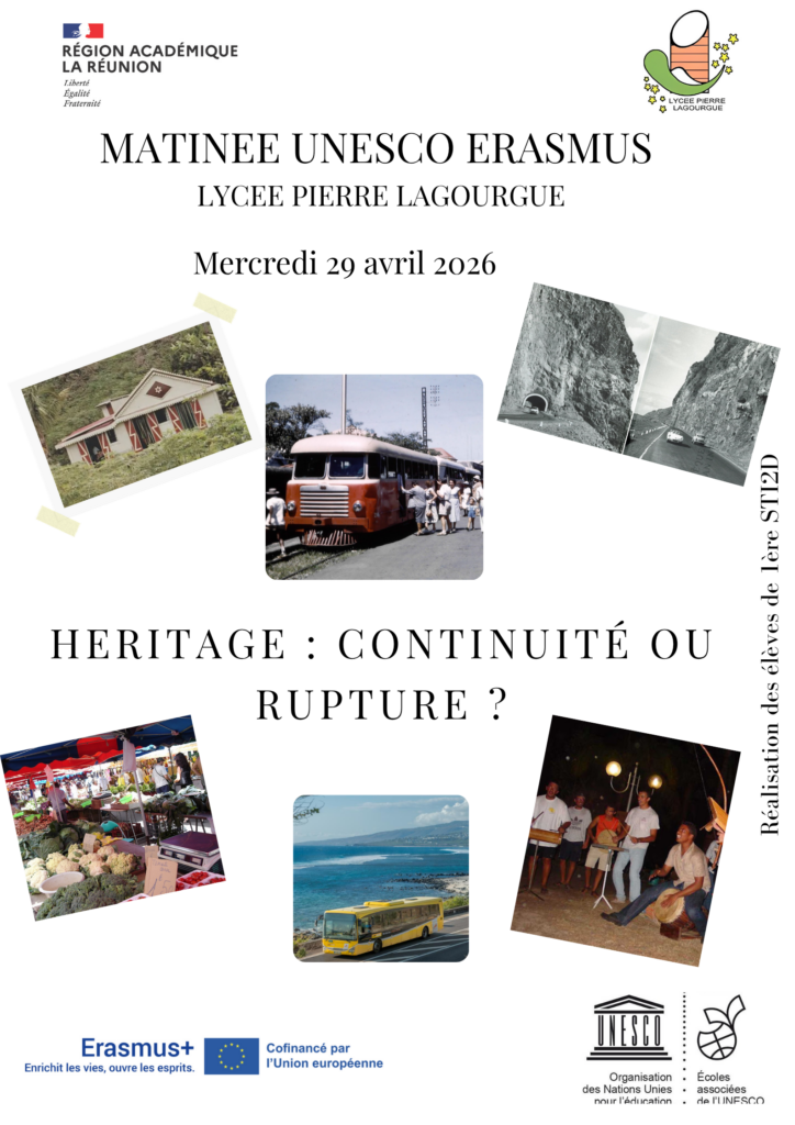 Cette année, cet événement se tiendra le mercredi 29 avril 2026 et le thème retenu sera : « Héritage : continuité ou rupture ? ». Merci aux élèves de 1ère STI2D pour la création de notre affiche (ci-dessous), pour cette demi-journée qui interroge notre héritage – héritage réunionnais d’abord, mais aussi, de manière plus large, notre rapport à la transmission, la coutume, le renouvellement, la rupture parfois nécessaire quand nos vies prennent un autre chemin.
