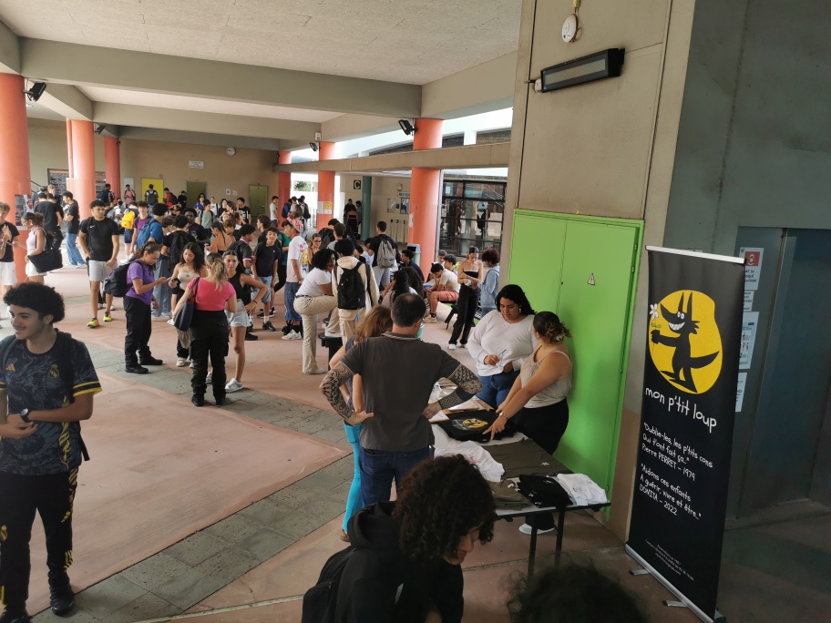 A l’extérieur, dans la cour, un petit stand proposait des prospectus informatifs ainsi que la vente de t-shirts, livres, livres CD, tote-bags en faveur de l’association « Mon P’tit Loup » …