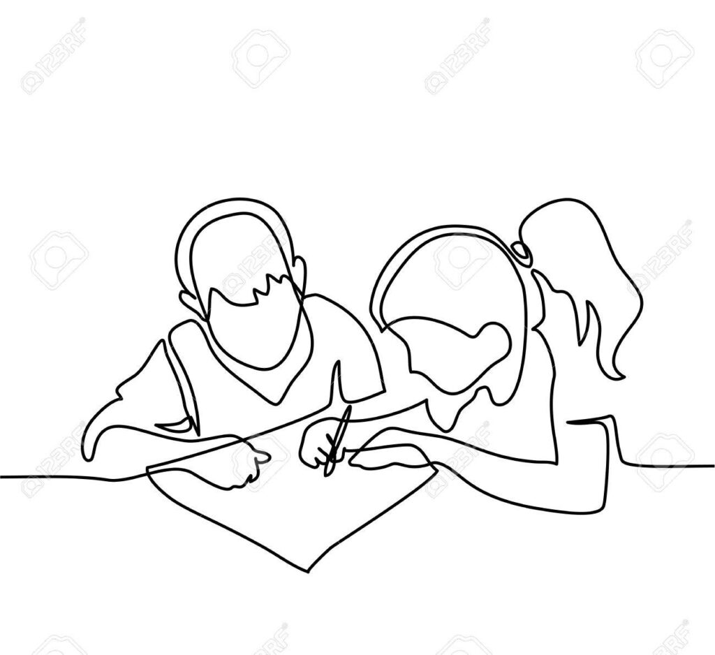Boy and girl drawing on paper Full size 1300 × 1191 pixels Boy and girl drawing on paper. Back to school concept. Continuous line drawing. Vector illustration on white background Previous image Next image