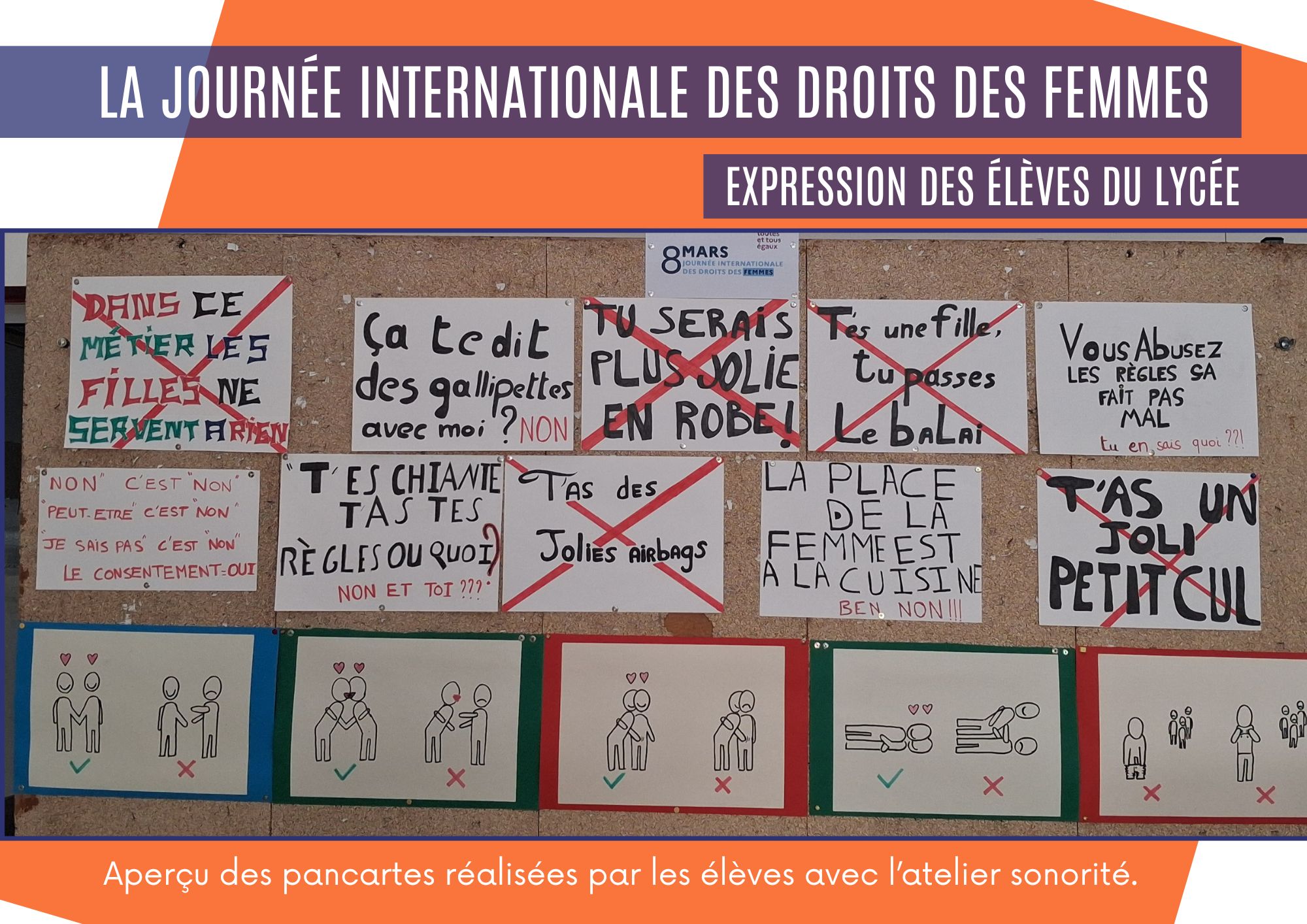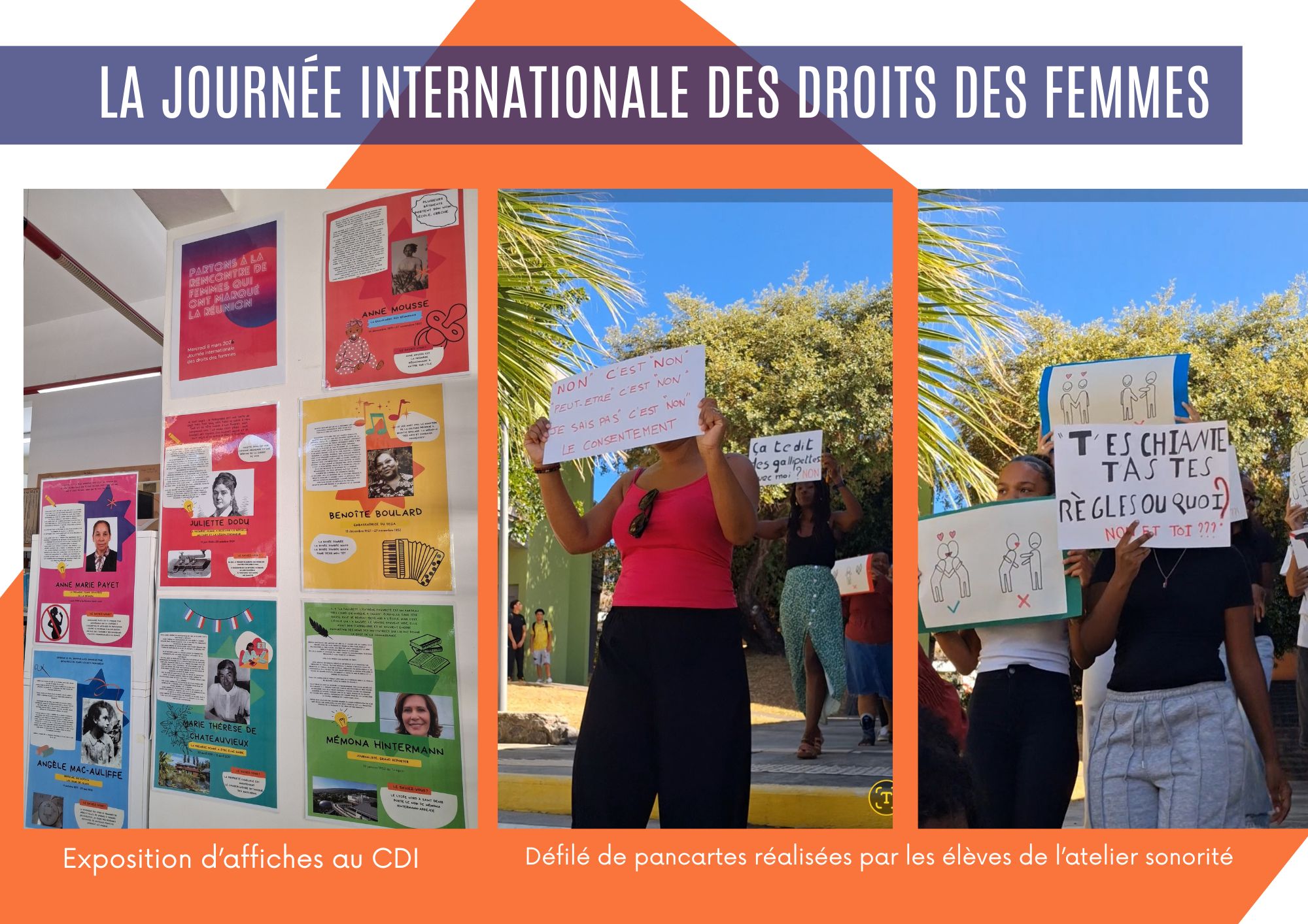 La Journée Internationales des Droits des Femmes a été commémorée fin mars par une exposition au CDI sur les Femmes Réunionnaises qui ont marqué l’histoire de l’île. Et un défilé de pancartes réalisées par les élèves de l’Atelier Sororité sur les propos sexistes (entendus au lycée) qui sont à bannir.