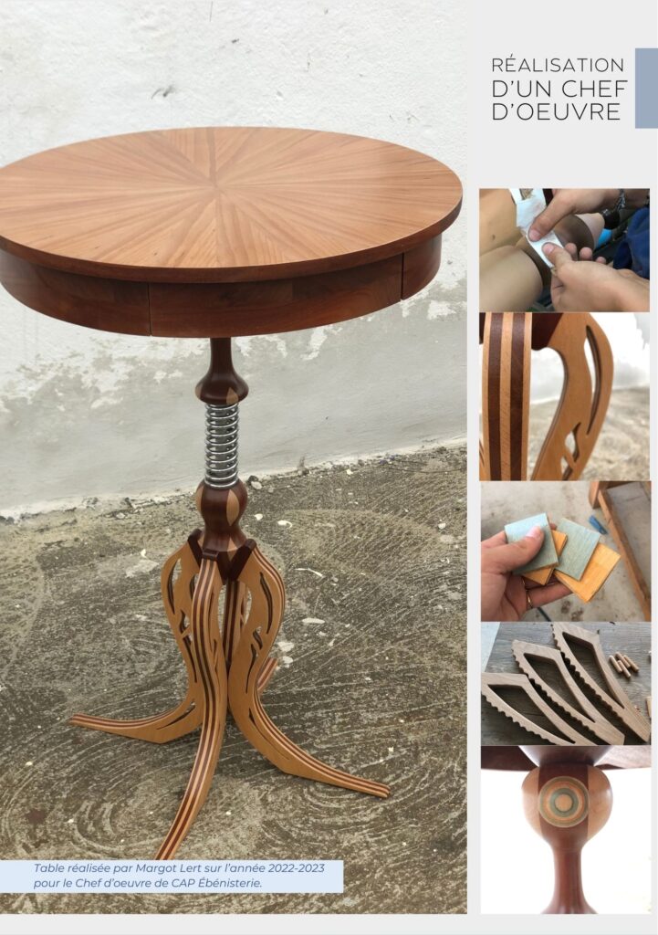 Après l’obtention du CAP ébéniste, le Brevet des Métiers d’Art (BMA) en ébénisterie permet d’acquérir des compétences supplémentaires. Les étudiants en BMA approfondissent leur aptitude à concevoir des pièces originales, en maîtrisant des techniques de fabrication et de finition plus complexes. Ils apprennent également à planifier et à exécuter des projets, tout en développant leurs compétences en communication et en argumentation, essentielles pour présenter et défendre leurs réalisations.