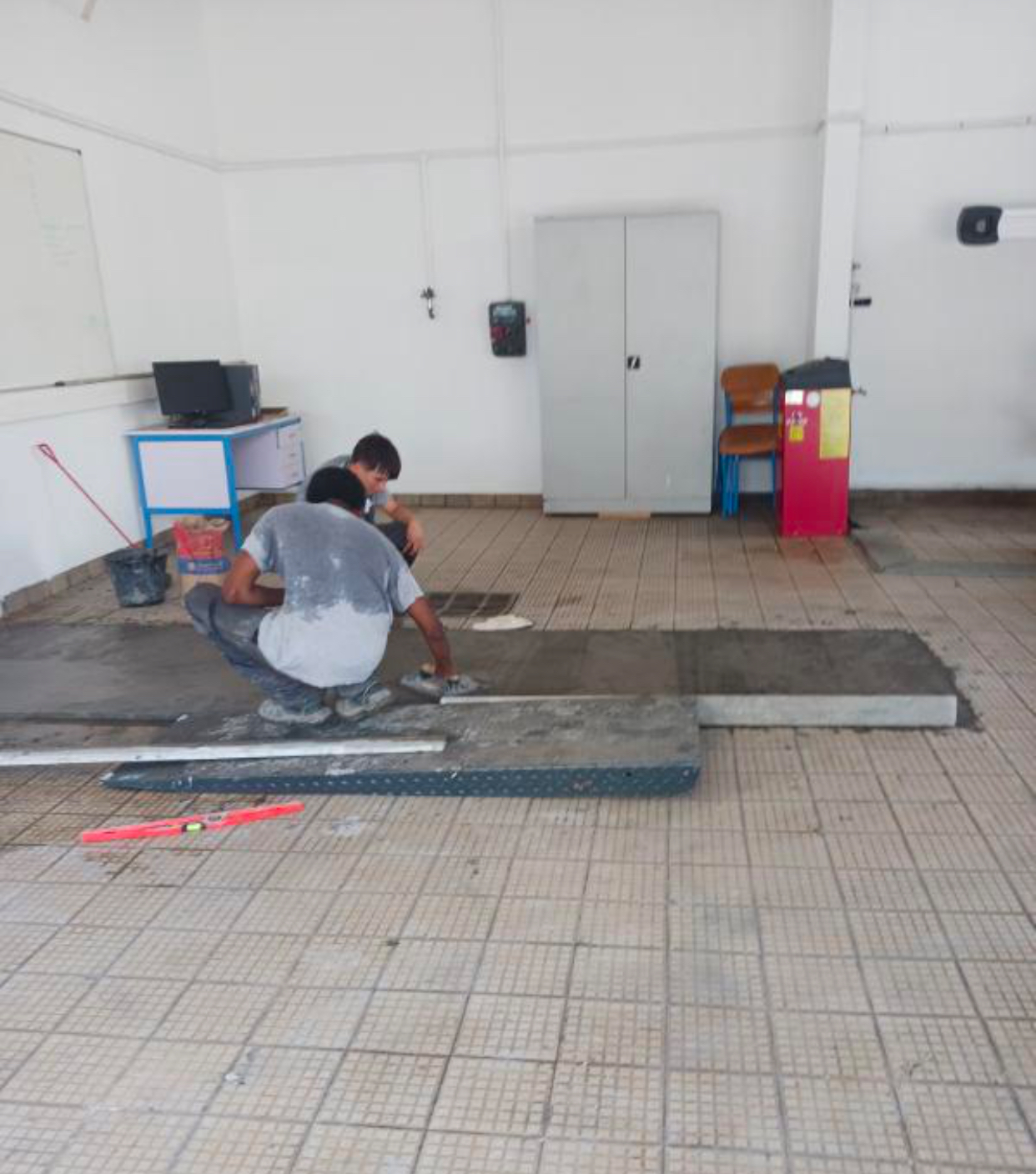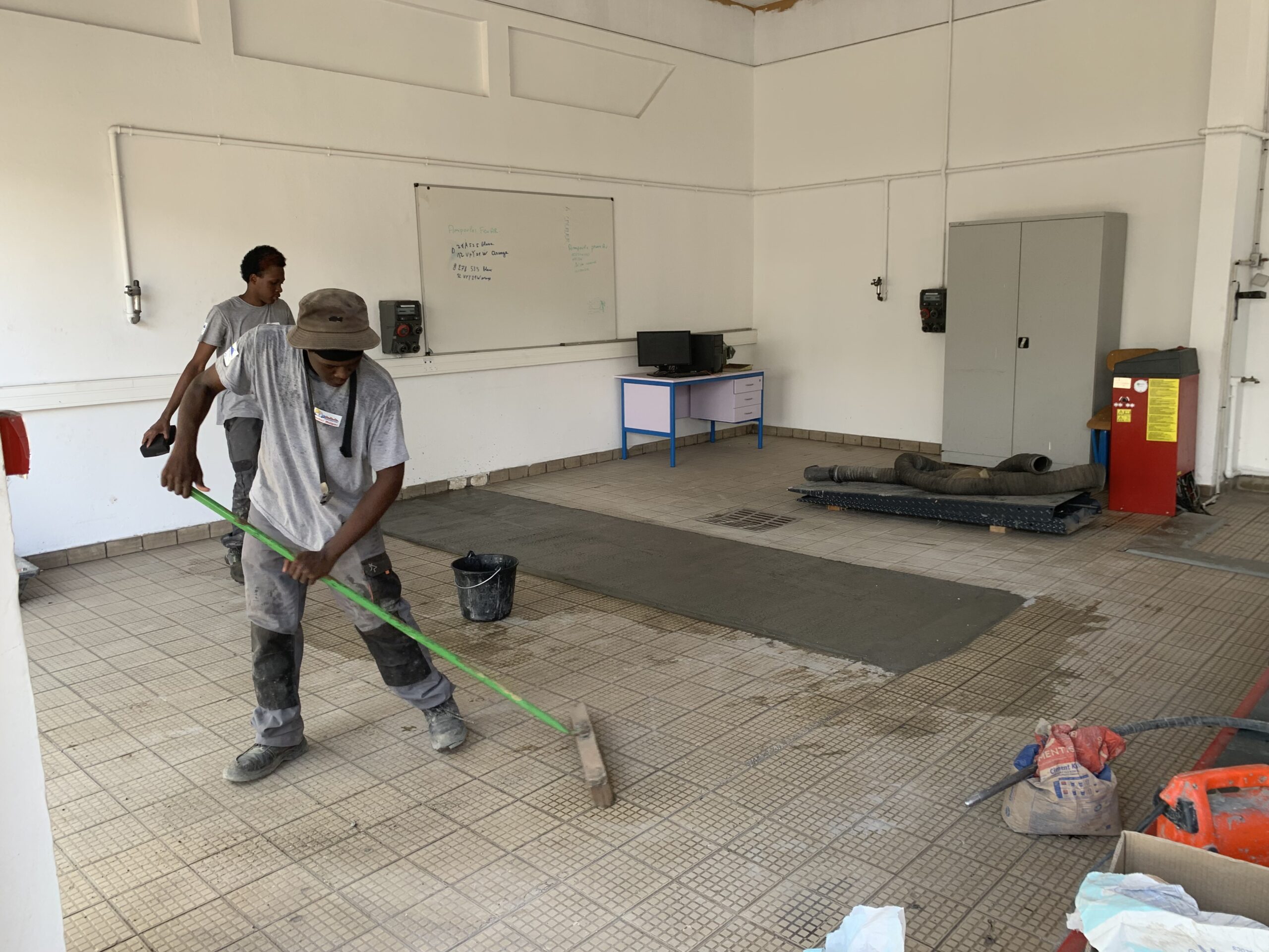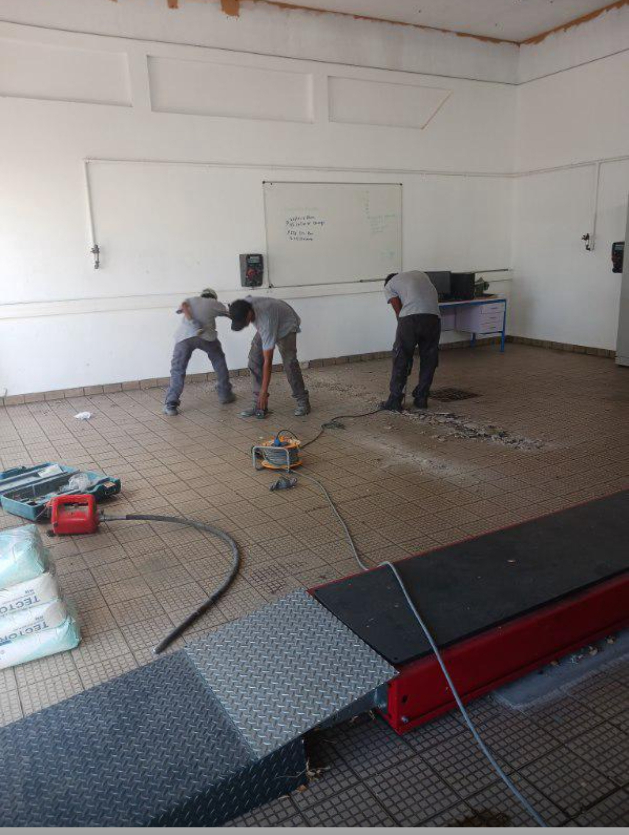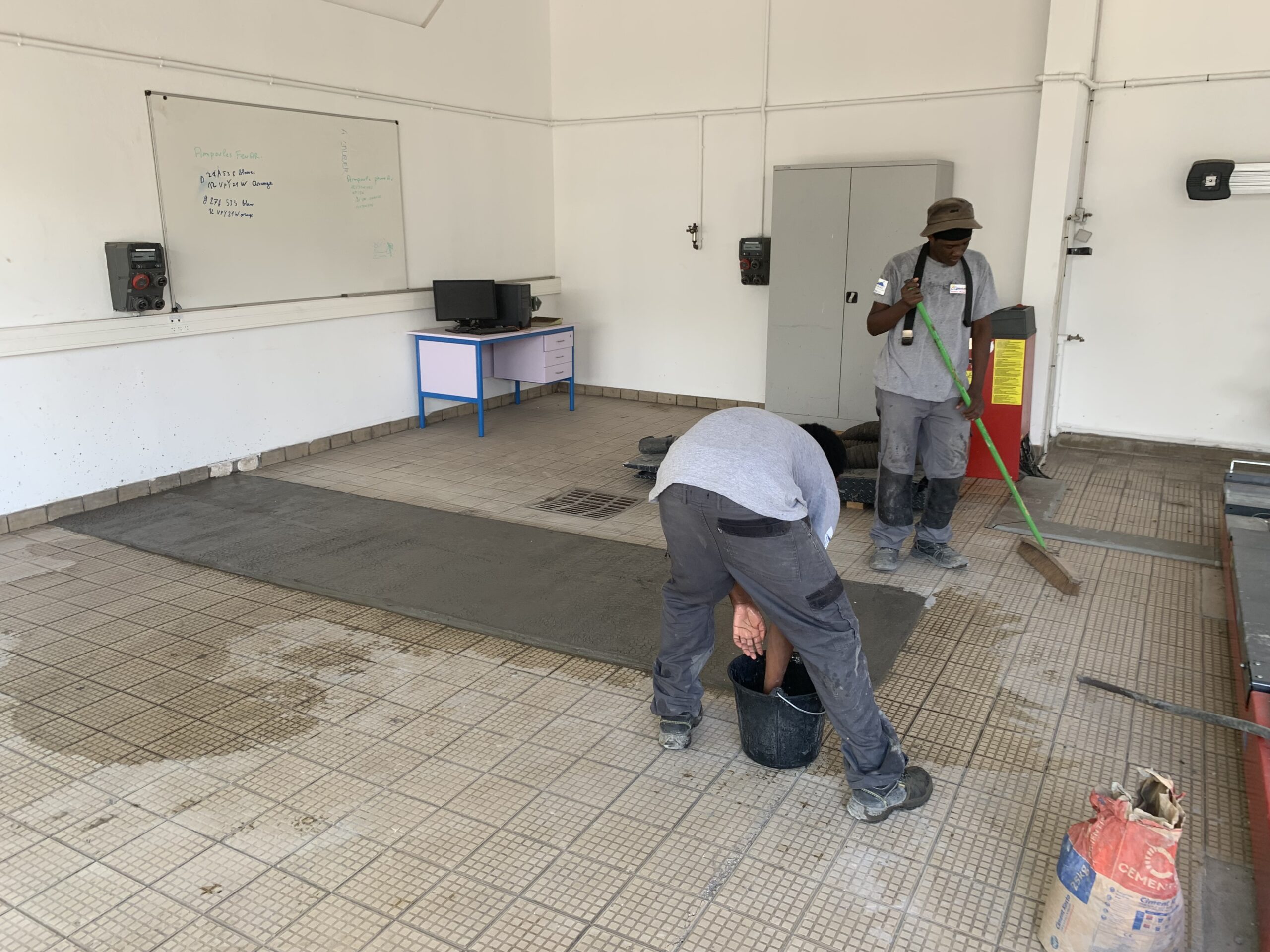 Réalisation d’une Chape en béton fibré taloché et bouchardé avec produit fixateur dans l’atelier de carrosserie automobile