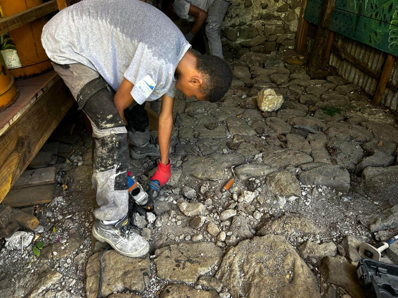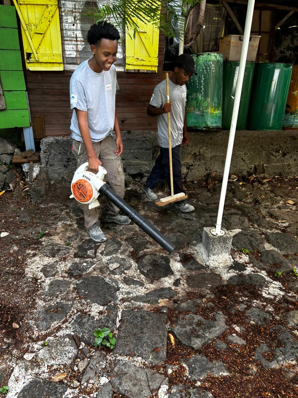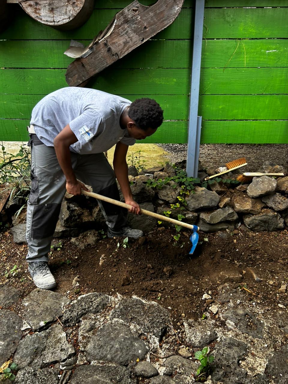 👉 Le chantier débute par la rénovation de l’Argamasse : aire plane constituée de roches volcaniques servant à sécher le café au soleil.