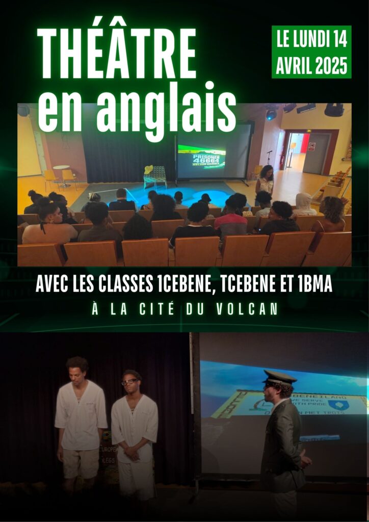 Les classes 1CEBENE, TCEBENE (CAP ébénisterie) et 1BMA (Brevet des métiers d’art ébénisterie) du lycée Roches Maigres sont allés à la Cité du Volcan le lundi 16 avril 2025 pour assister à la représentation d’une pièce de théâtre en anglais intitulée « The Life of Nelson Mandela ». Cette œuvre, d’une durée d’1h30 et mise en scène par Lucille O’Flanagan, retrace la vie de Mandela.