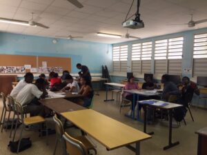 Un des groupes a souhaité s’emparer de la problématique de la lutte contre le gaspillage alimentaire au réfectoire de la cité scolaire : vaste chantier qui les amènera à collaborer avec les éco-délégués du collège Leconte de Lisle et du lycée Antoine Roussin, nos voisins avec qui nous partageons les repas et l’internat.
