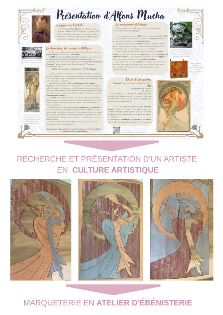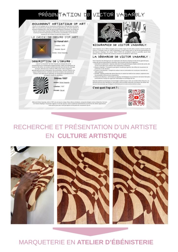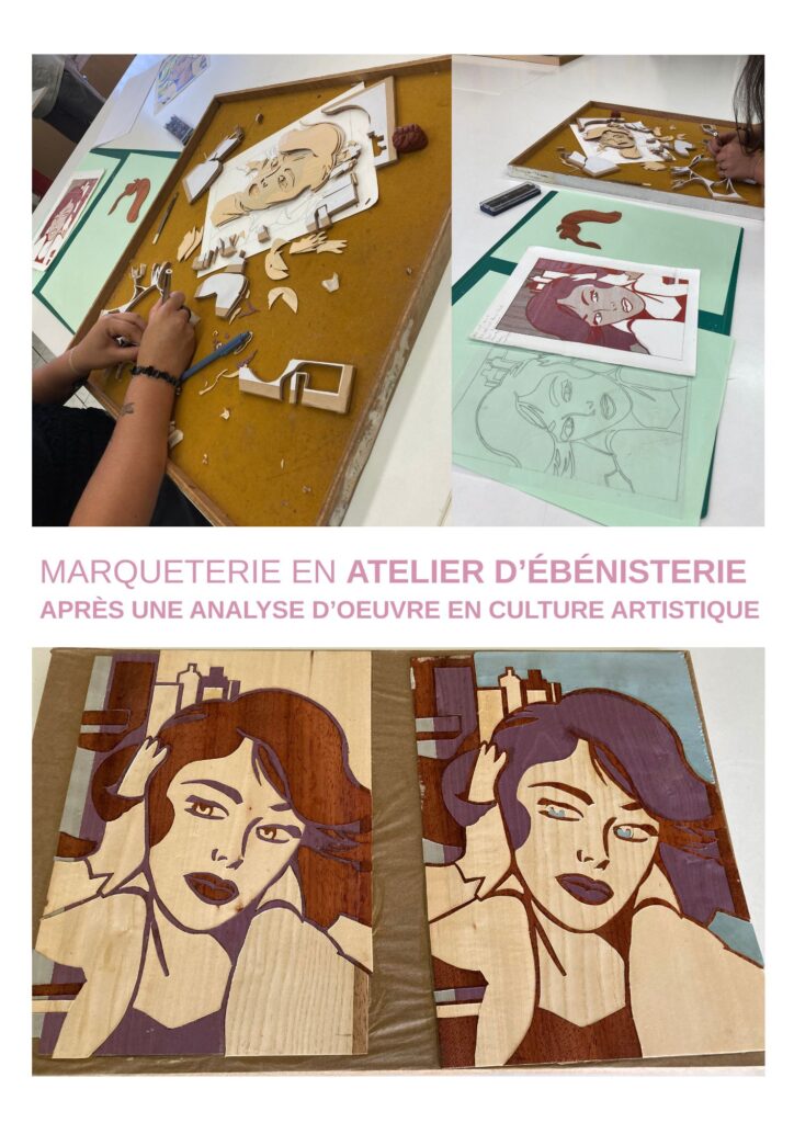 En parallèle, en atelier d’ébénisterie, les élèves explorent la technique de la marqueterie, en choisissant une gamme de 2 à 4 placages de bois de couleurs variées. Chaque élève propose de revisiter l’œuvre étudiée en culture artistique, en la simplifiant pour produire une marqueterie.