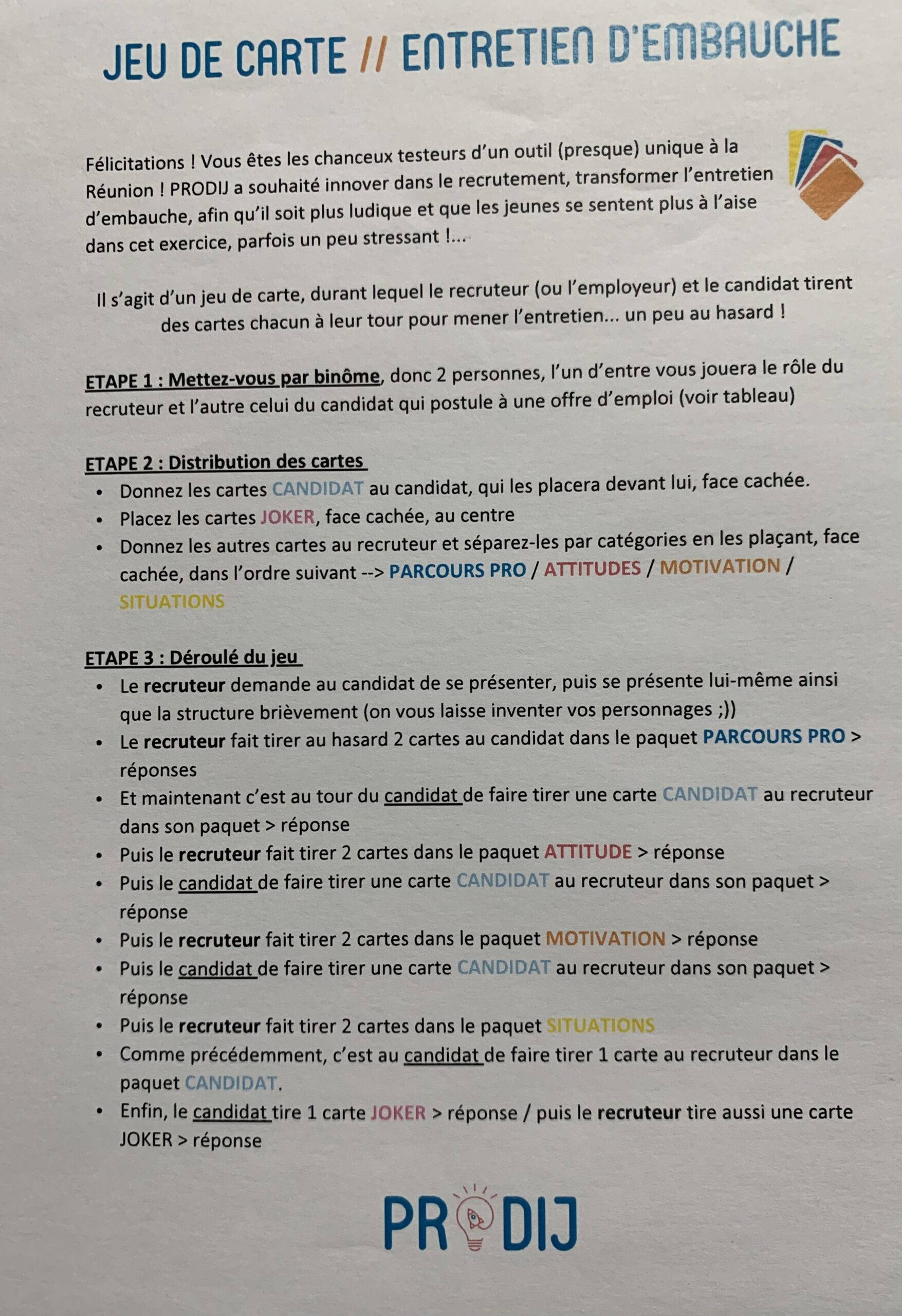 👉 Un Vis ma vie composé de cartes de questionnements thématiques Attitude-Motivation—Situation permet aux élèves de se mettre tantôt dans la peau de l’employeur tantôt dans la peau d’un candidat tél un « Vis Ma Vie » lors d’une simulation d’entretien de recrutement
