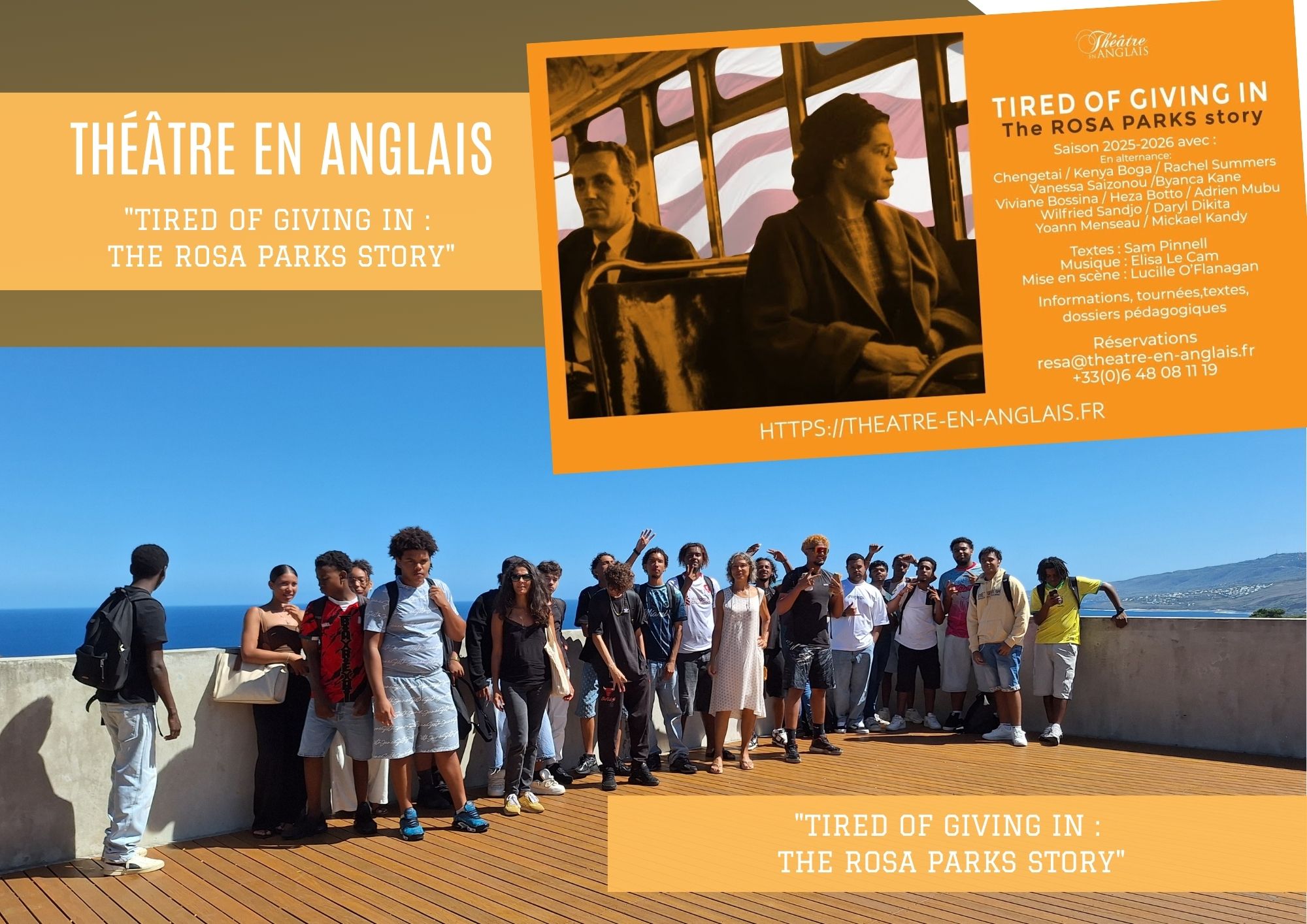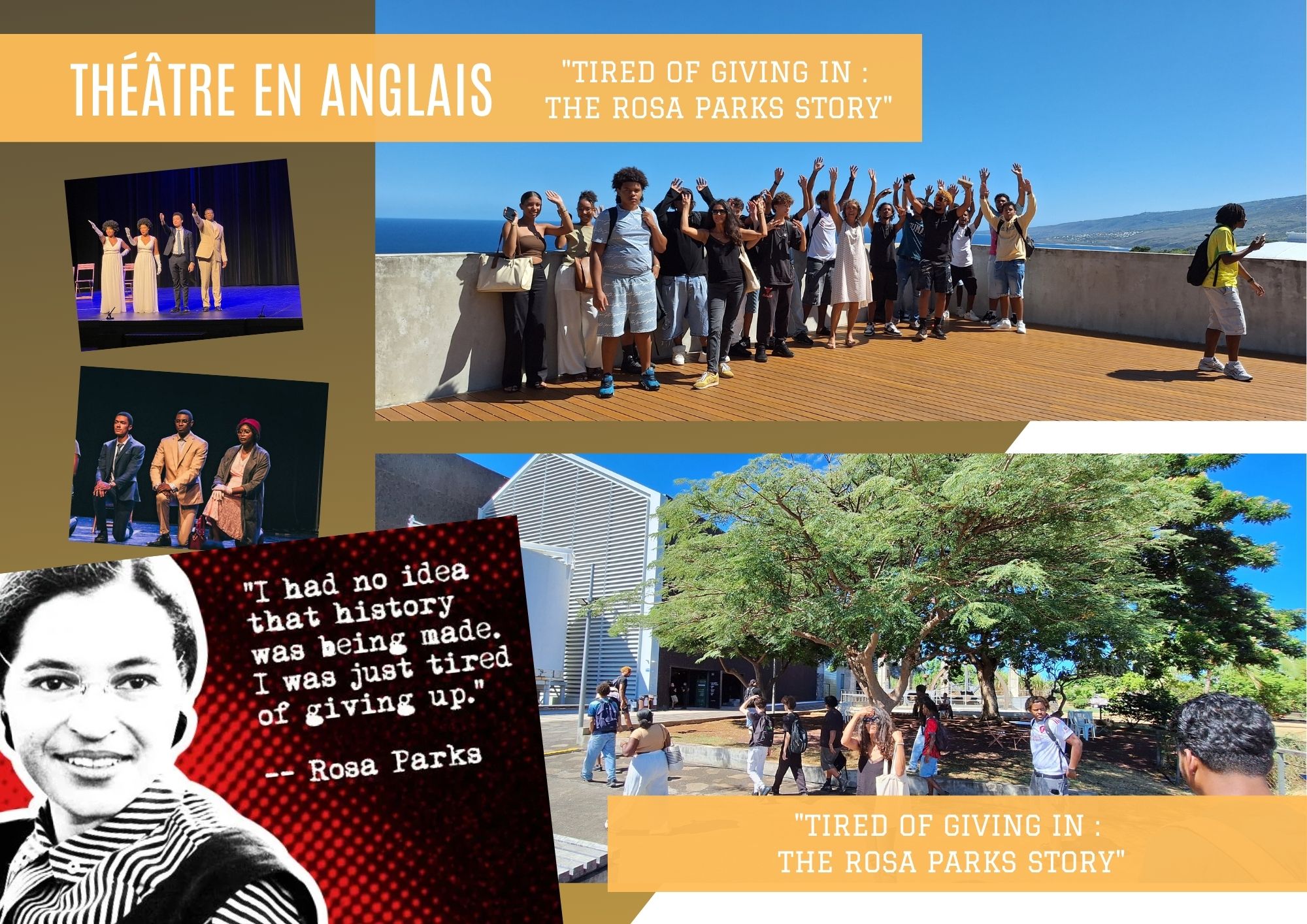 Le mardi 7 avril 2026, les classes TBMELEC (bac pro métiers de l’électricité et de ses environnements connectés), 1STS et 2BTP1 (2de professionnelle métiers de la construction durable, du bâtiment et des travaux publics) se sont rendues à la salle Pierre Roseli de Stella Matutina afin d’assister à la représentation d’une pièce de théâtre en anglais, Tired of Giving In: The Rosa Parks Story (« Marre de céder : l’histoire de Rosa Parks »).