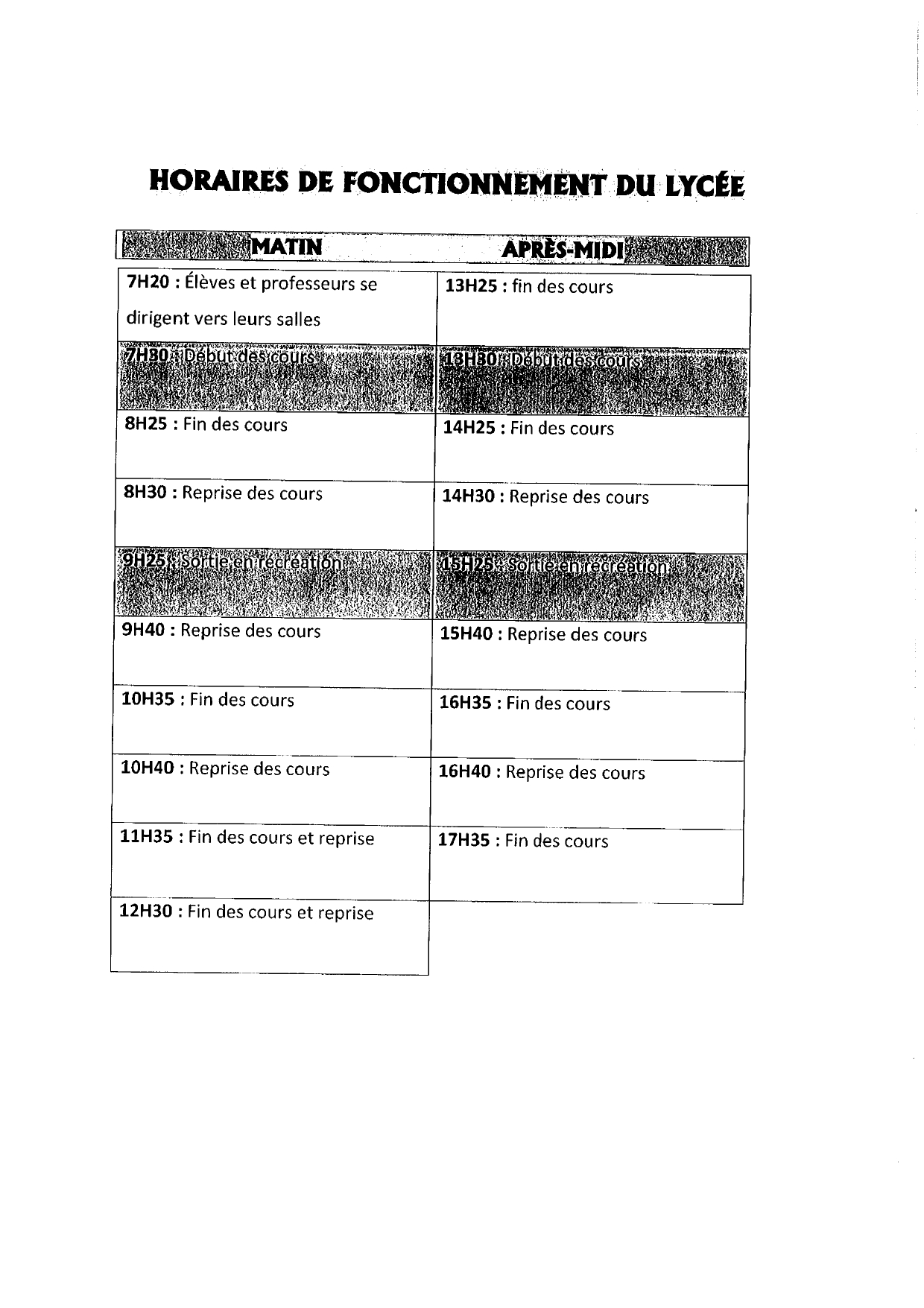 HORAIRES DE FONCTIONNEMENT DU LYCEE ROLAND GARROS