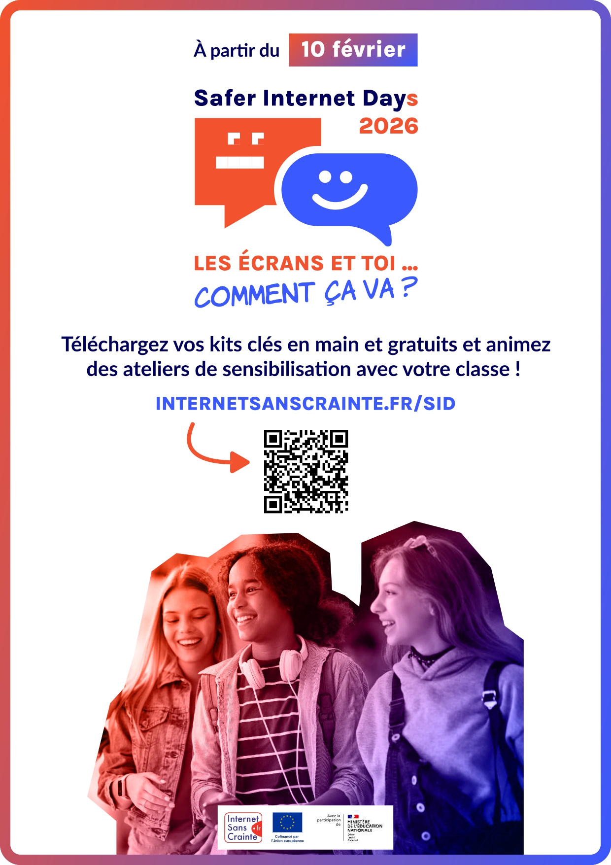 À l’occasion du Safer Internet Day, Internet Sans Crainte, programme national de sensibilisation des jeunes au numérique, vous propose de préparer cette journée à travers la création d’une affiche sur la thématique du Safer Internet Day 2026 :