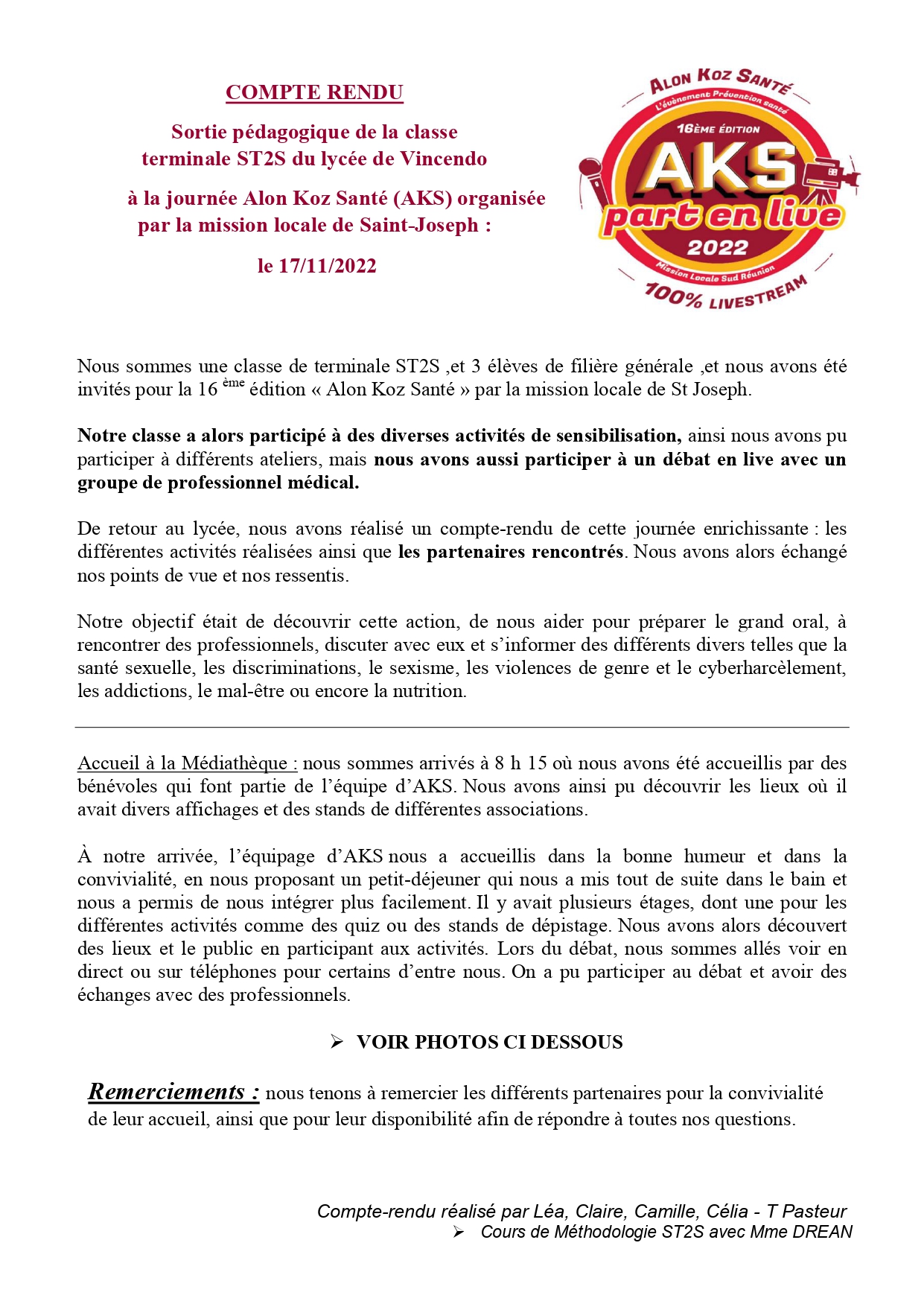 Compte-rendu réalisé par Léa, Claire, Camille, Célia – T Pasteur Cours de Méthodologie ST2S avec Mme DREAN